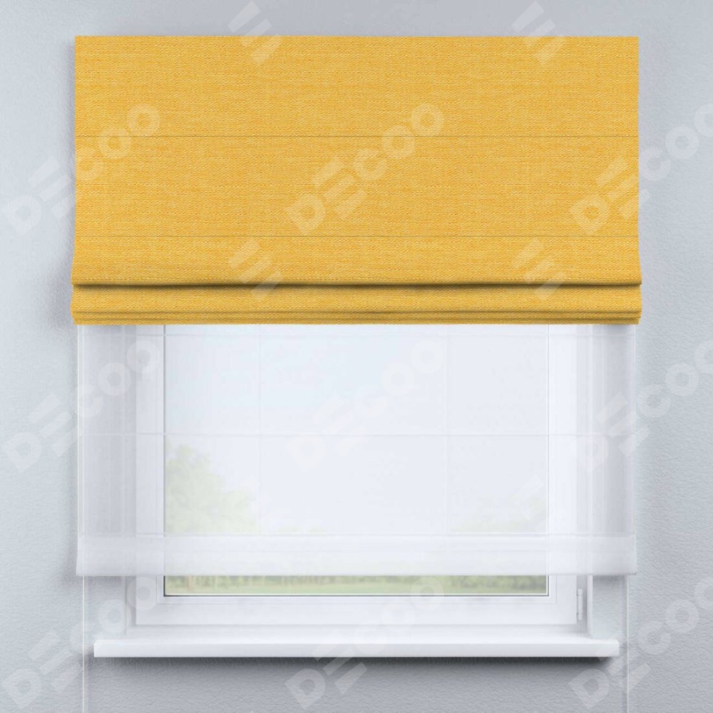 Римская штора день-ночь производителя «Cortin», используется для проёма, пошита из двух полотен, с лицевой стороны лён жёлтый артикул 63738, вторая ткань тюль (по стандарту комплектуется тюль белого цвета артикул V-01). Имеет универсальный механизм и подходит для монтажа: на потолок, на стену и в нишу.
