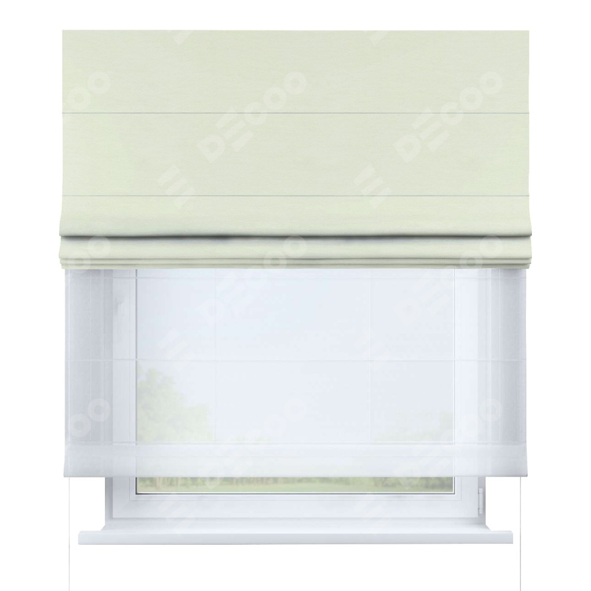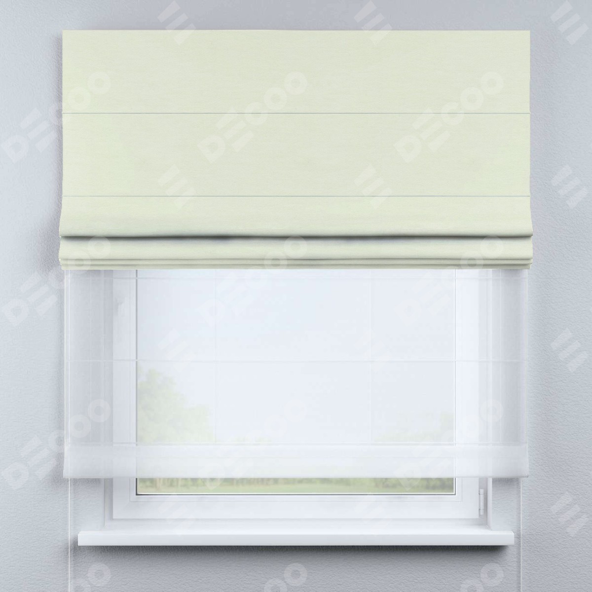 Римская штора день-ночь производителя «Cortin», используется для проёма, пошита из двух полотен, с лицевой стороны вельвет молочный артикул 85536, вторая ткань тюль (по стандарту комплектуется тюль белого цвета артикул V-01). Имеет универсальный механизм и подходит для монтажа: на потолок, на стену и в нишу.