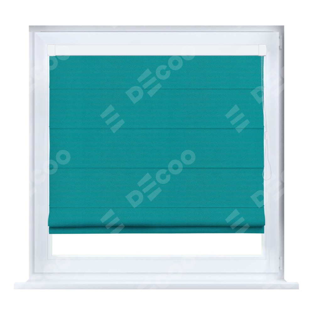 Римская штора кассетного типа, производителя «Cortin», устанавливается только на пластиковые окна и прилегает к стеклопакету, пошита из ткани блэкаут однотонный бирюзовый, артикул 88297.