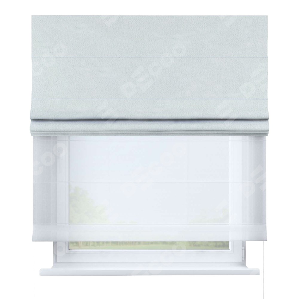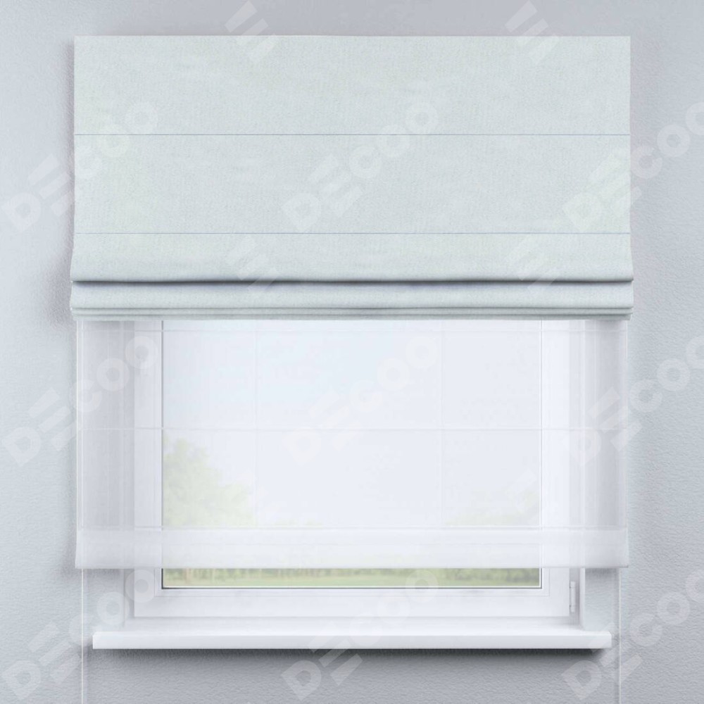 Римская штора день-ночь производителя «Cortin», используется для проёма, пошита из двух полотен, с лицевой стороны блэкаут однотонный дымчато-молочный артикул 88282, вторая ткань тюль (по стандарту комплектуется тюль белого цвета артикул V-01). Имеет универсальный механизм и подходит для монтажа: на потолок, на стену и в нишу.