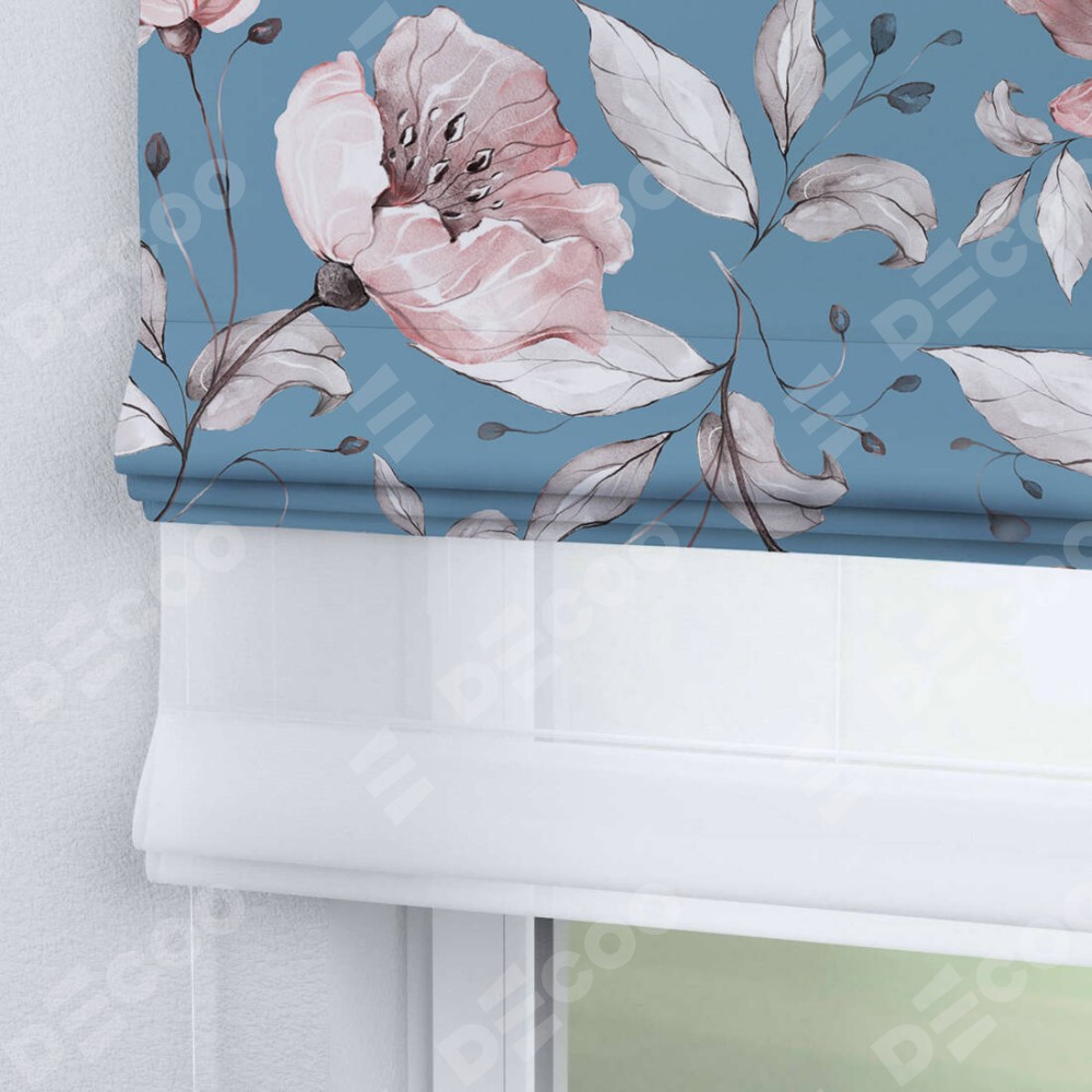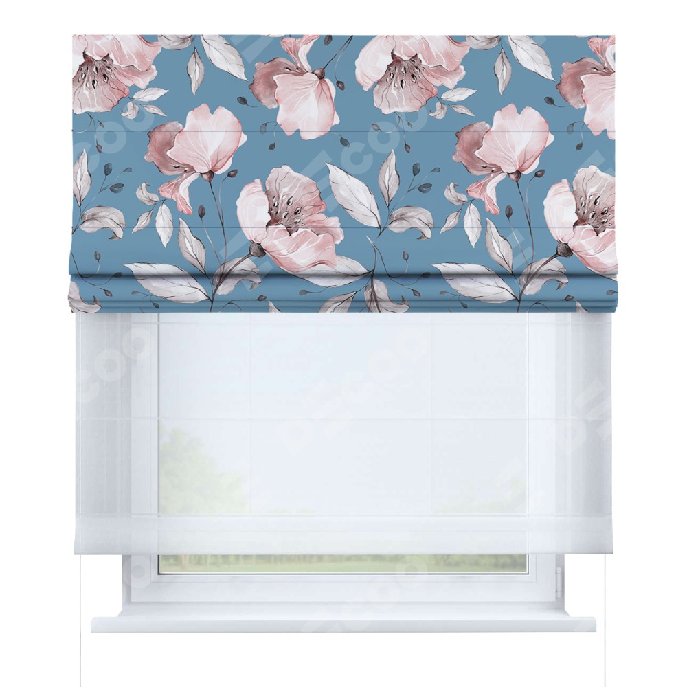 Римская штора день-ночь производителя «Cortin», используется для проёма, пошита из двух полотен, с лицевой блэкаут с нанесением сублимационной печати «Розовая лагуна», вторая ткань тюль (по стандарту комплектуется тюль белого цвета артикул V-01). Имеет универсальный механизм и подходит для монтажа: на потолок, на стену и в нишу.