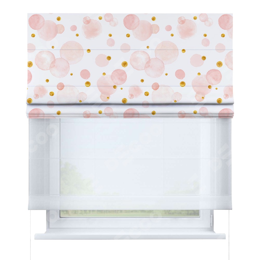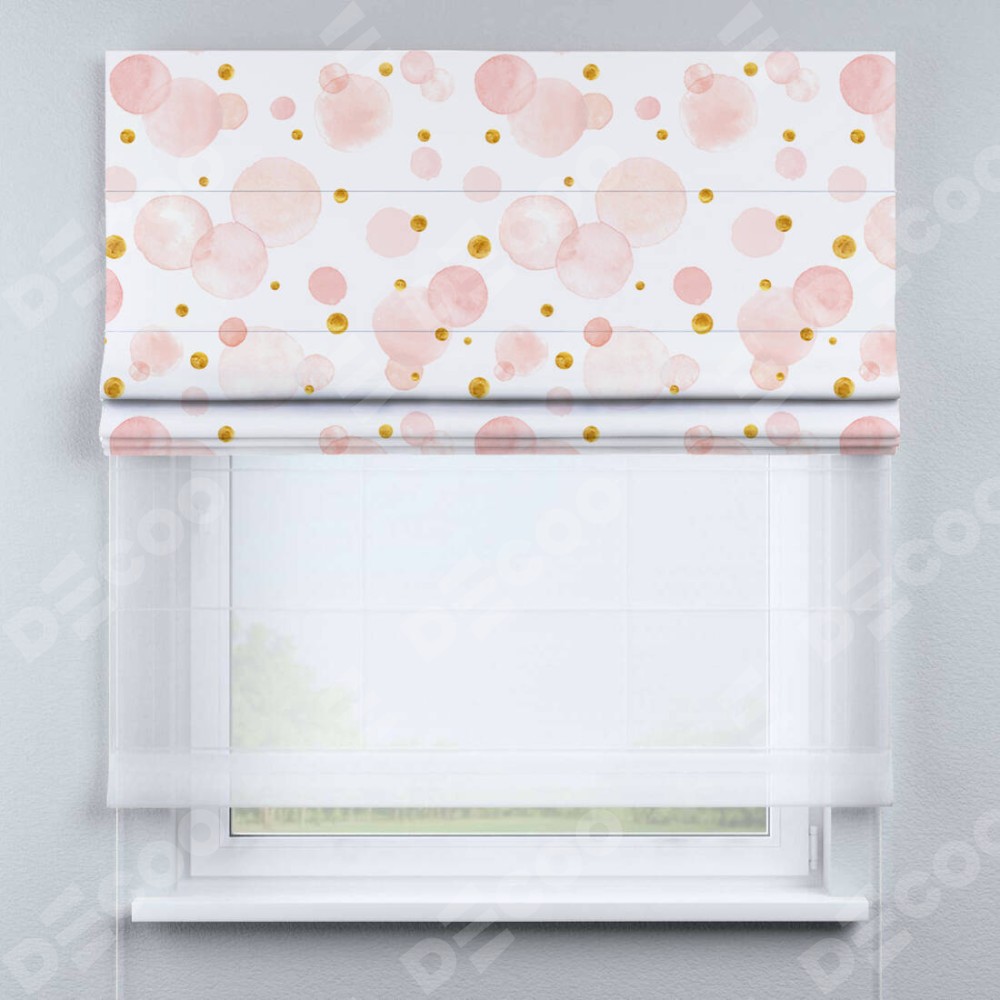 Римская штора день-ночь производителя «Cortin», используется для проёма, пошита из двух полотен, с лицевой блэкаут с нанесением сублимационной печати «Круги и точки», вторая ткань тюль (по стандарту комплектуется тюль белого цвета артикул V-01). Имеет универсальный механизм и подходит для монтажа: на потолок, на стену и в нишу.