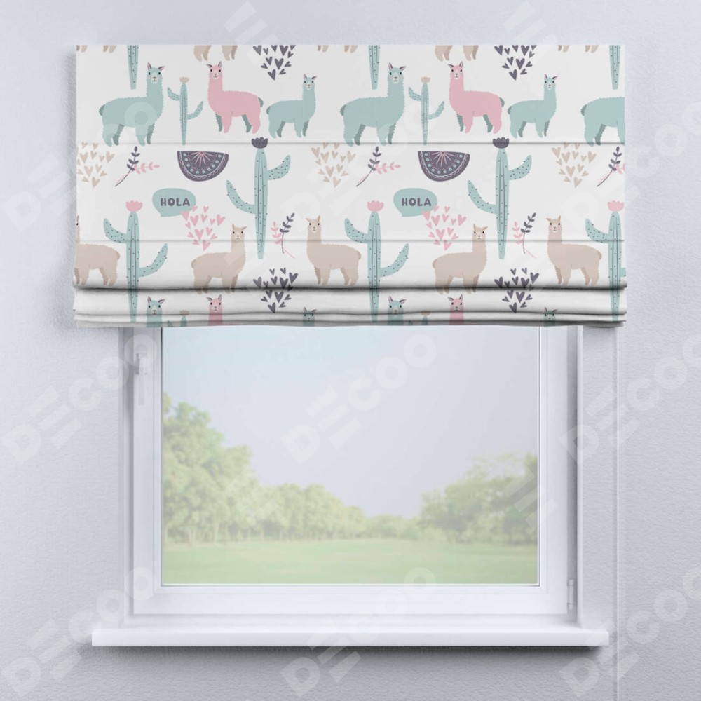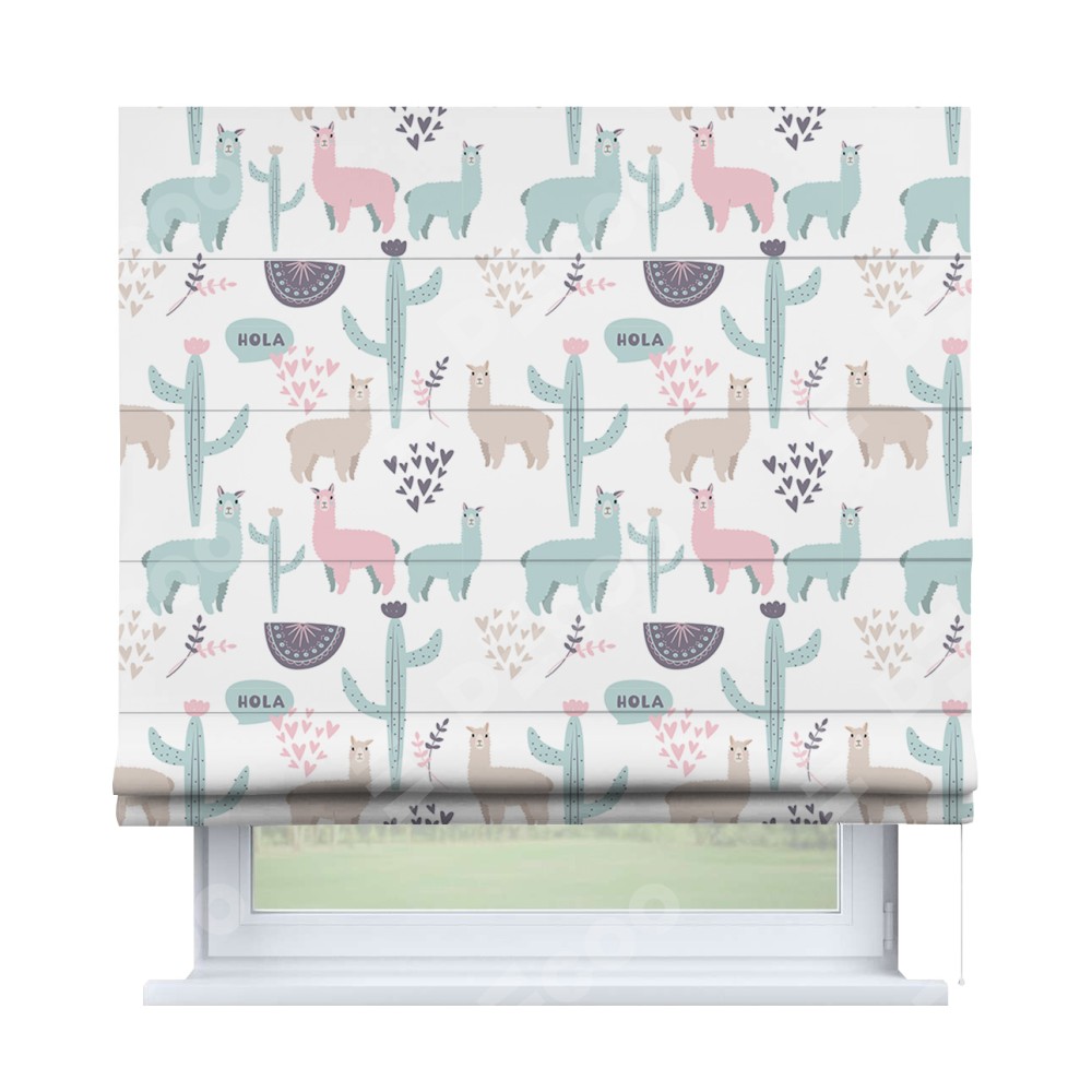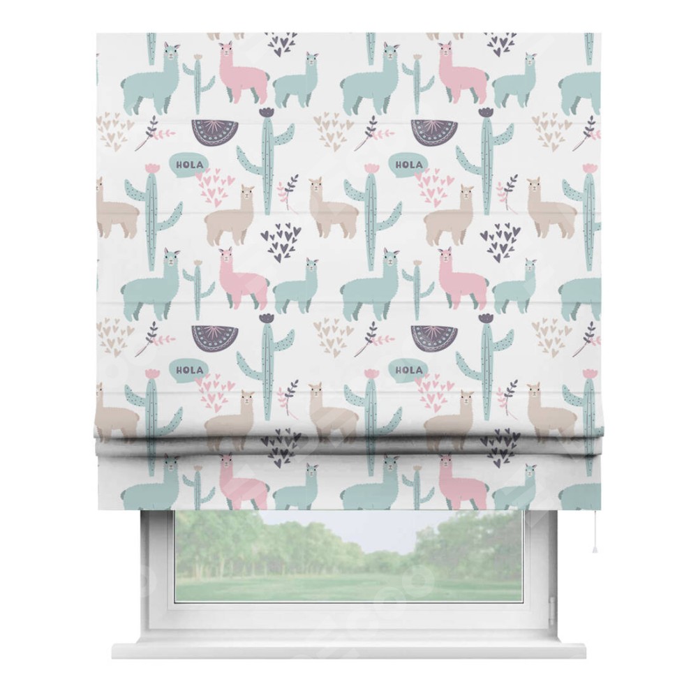 Римская штора производителя «Cortin», используется для проёма, пошита из ткани блэкаут с нанесением сублимационной печати «Милый лама». Имеет универсальный механизм и подходит для монтажа: на потолок, на стену и в нишу.