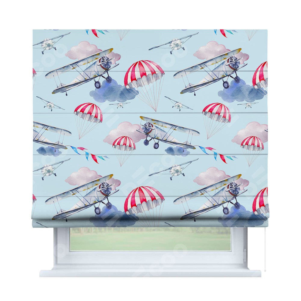 Римская штора производителя «Cortin», используется для проёма, пошита из ткани блэкаут с нанесением сублимационной печати «Самолёт». Имеет универсальный механизм и подходит для монтажа: на потолок, на стену и в нишу.