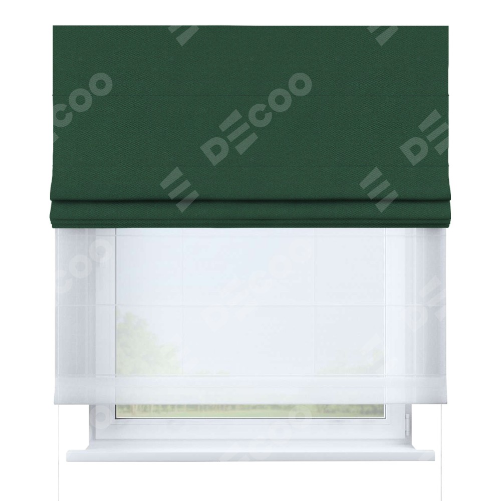 Римская штора день-ночь производителя «Cortin», используется для проёма, пошита из двух полотен, с лицевой стороны лён димаут тёмно-зелёный артикул 16246, вторая ткань тюль (по стандарту комплектуется тюль белого цвета артикул V-01). Имеет универсальный механизм и подходит для монтажа: на потолок, на стену и в нишу.