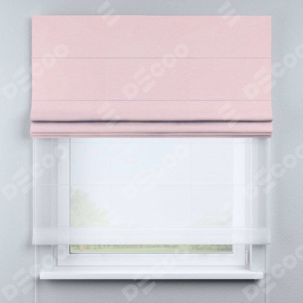 Римская штора день-ночь производителя «Cortin», используется для проёма, пошита из двух полотен, с лицевой стороны блэкаут однотонный розовый артикул 83046, вторая ткань тюль (по стандарту комплектуется тюль белого цвета артикул V-01). Имеет универсальный механизм и подходит для монтажа: на потолок, на стену и в нишу.