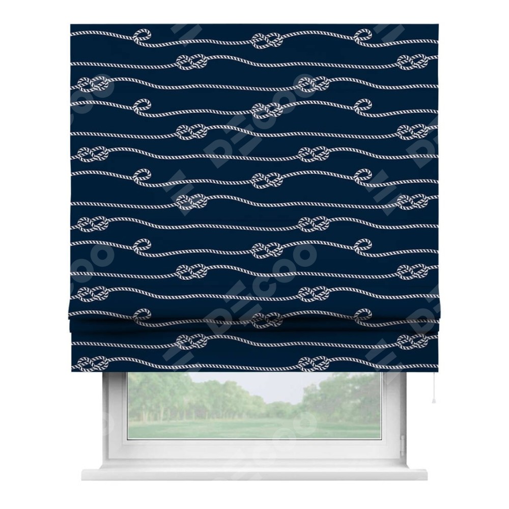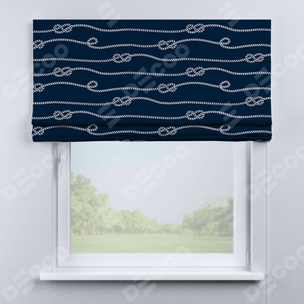 Римская штора производителя «Cortin», используется для проёма, пошита из ткани блэкаут с нанесением сублимационной печати «Морской узел». Имеет универсальный механизм и подходит для монтажа: на потолок, на стену и в нишу.
