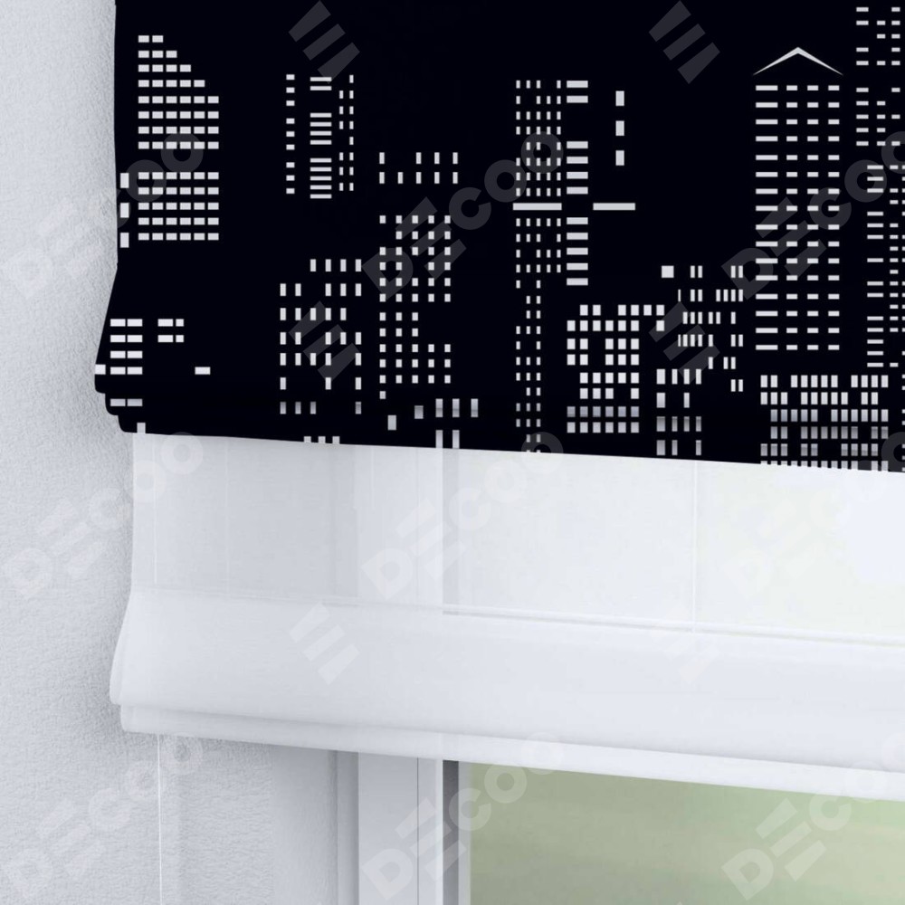 Римская штора день-ночь производителя «Cortin», используется для проёма, пошита из двух полотен, с лицевой блэкаут с нанесением сублимационной печати «Ночной город», вторая ткань тюль (по стандарту комплектуется тюль белого цвета артикул V-01). Имеет универсальный механизм и подходит для монтажа: на потолок, на стену и в нишу.