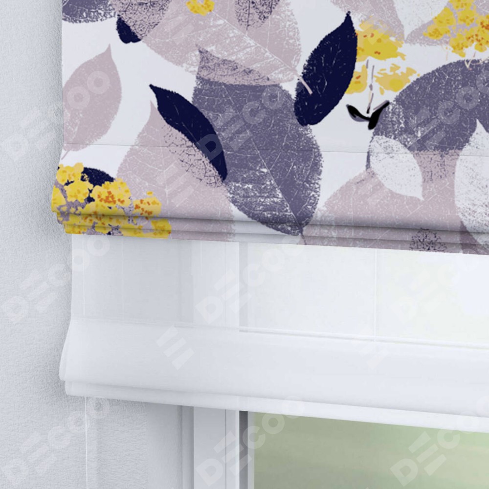 Римская штора день-ночь производителя «Cortin», используется для проёма, пошита из двух полотен, с лицевой блэкаут с нанесением сублимационной печати «Листопад», вторая ткань тюль (по стандарту комплектуется тюль белого цвета артикул V-01). Имеет универсальный механизм и подходит для монтажа: на потолок, на стену и в нишу.