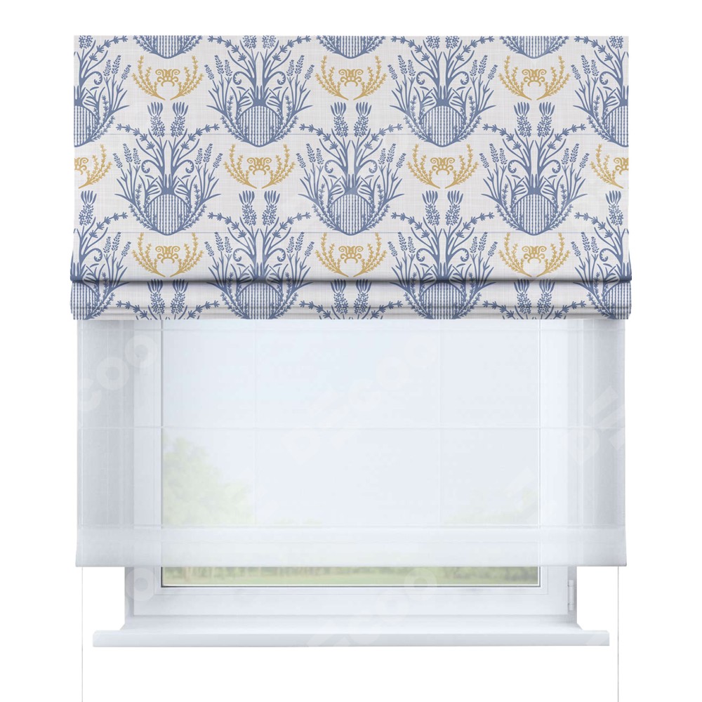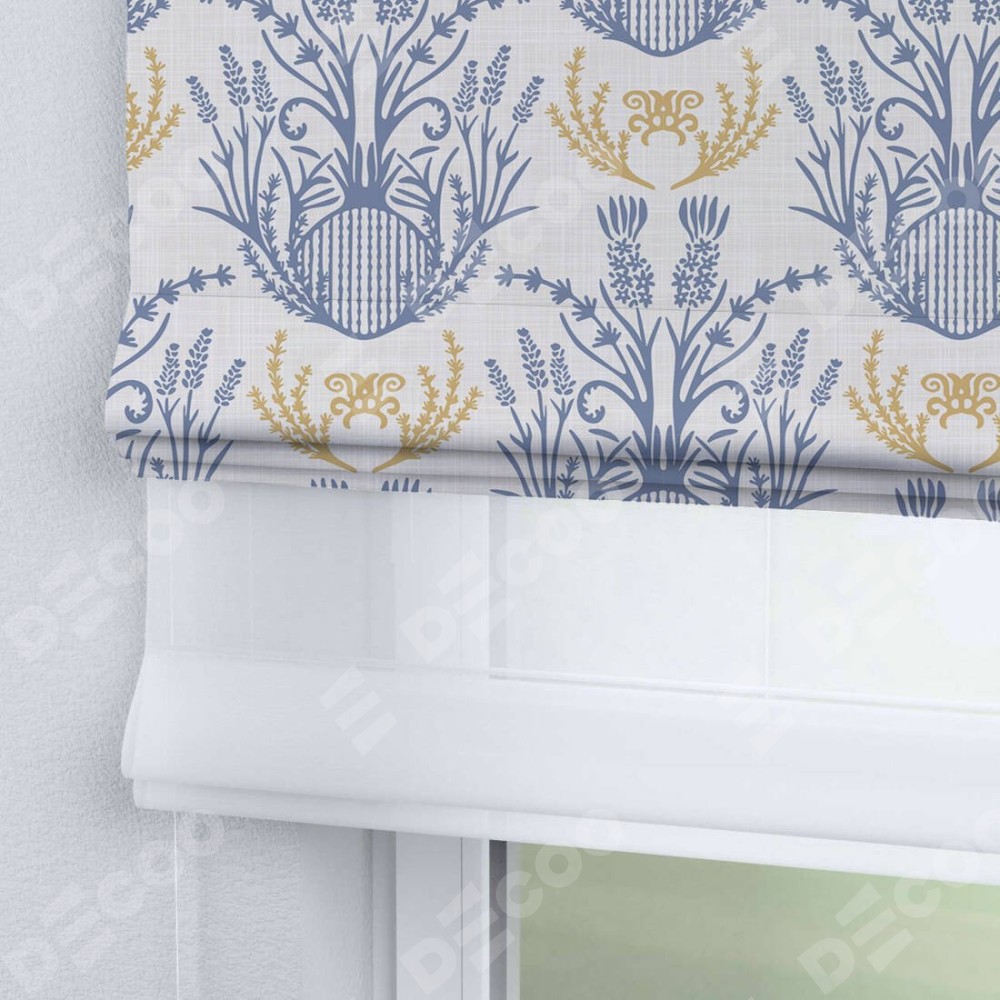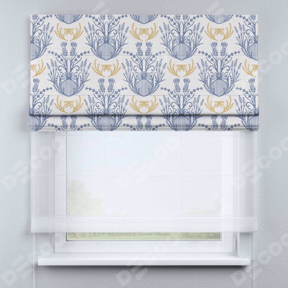 Римская штора день-ночь производителя «Cortin», используется для проёма, пошита из двух полотен, с лицевой блэкаут с нанесением сублимационной печати «Шикарная лаванда», вторая ткань тюль (по стандарту комплектуется тюль белого цвета артикул V-01). Имеет универсальный механизм и подходит для монтажа: на потолок, на стену и в нишу.