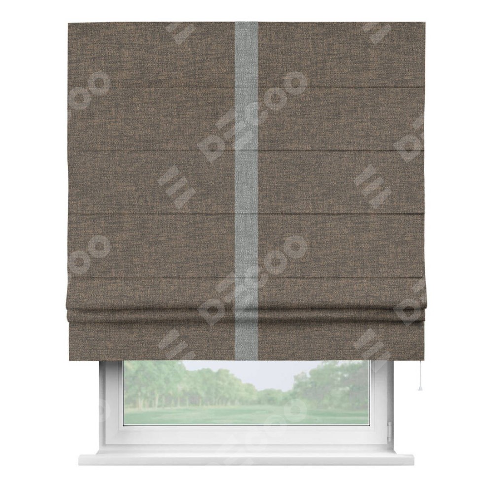 Римская штора производителя «Cortin», используется для проёма, пошита из ткани рогожка димаут коричневый, артикул 80420. Отделка шторы кантом «Хайвэй», ткань для канта используется из рогожки димаут разной расцветки на выбор. Имеет универсальный механизм и подходит для монтажа: на потолок, на стену и в нишу.
