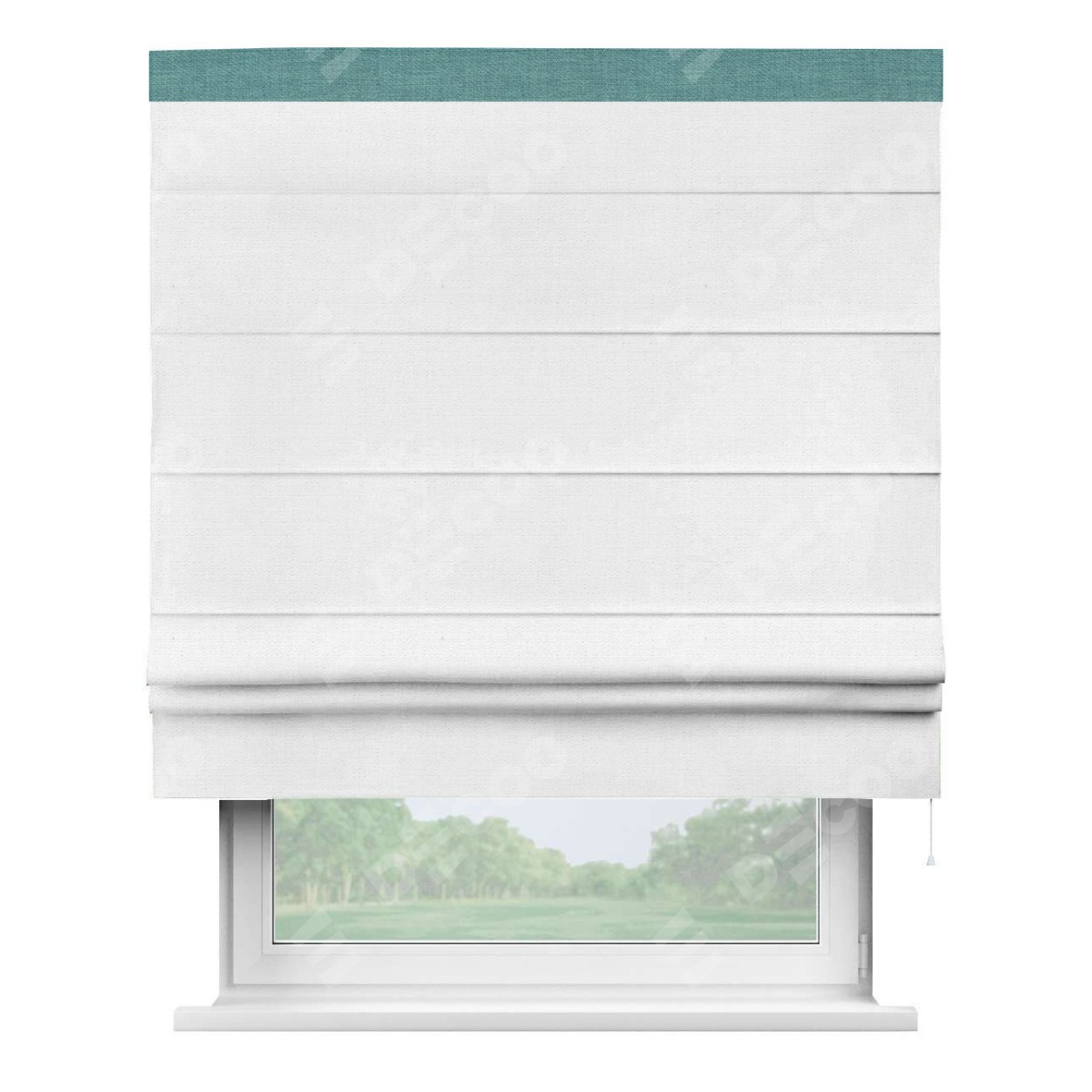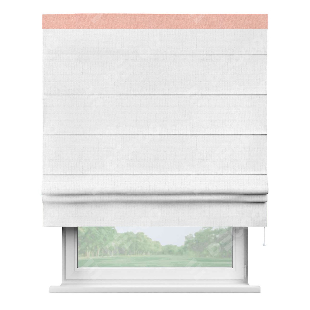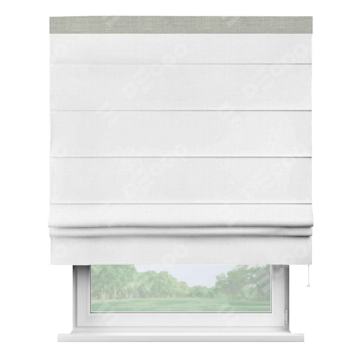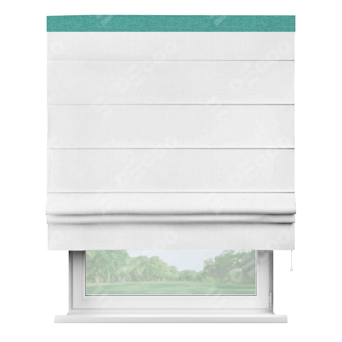 Римская штора производителя «Cortin», используется для проёма, пошита из ткани лён белый, артикул 53430. Отделка шторы кантом «Кинг», ткань для канта используется из льна разной расцветки на выбор. Имеет универсальный механизм и подходит для монтажа: на потолок, на стену и в нишу.