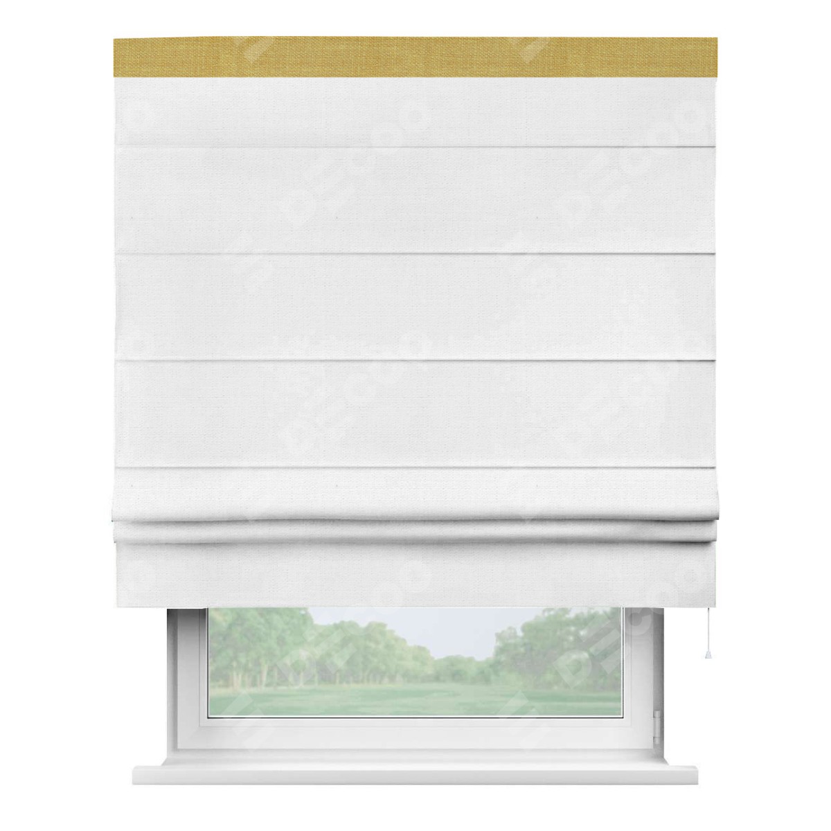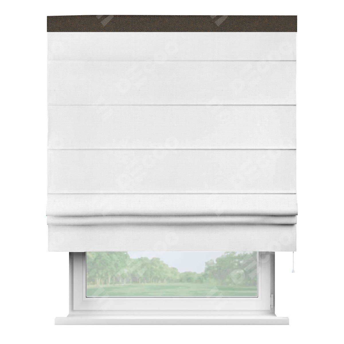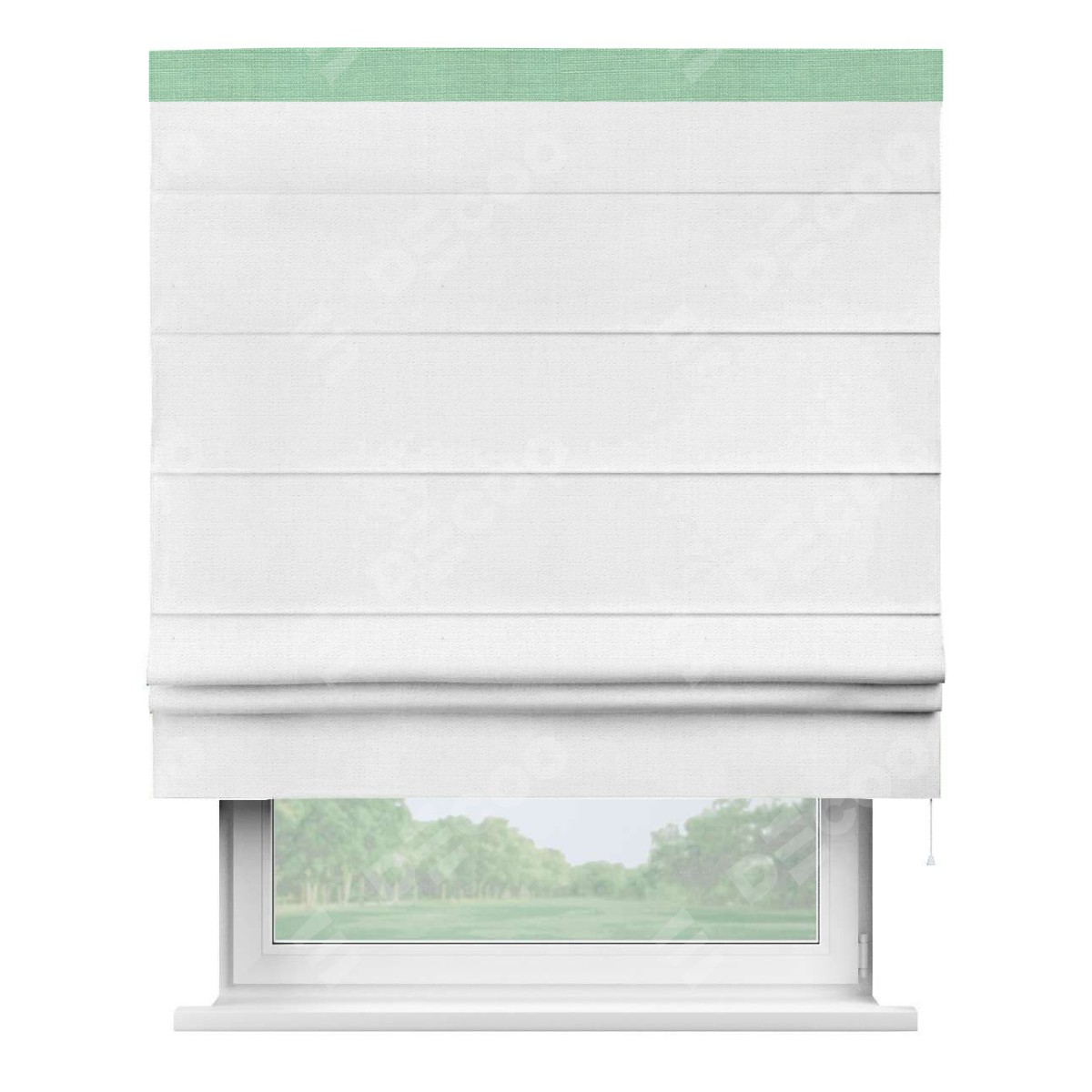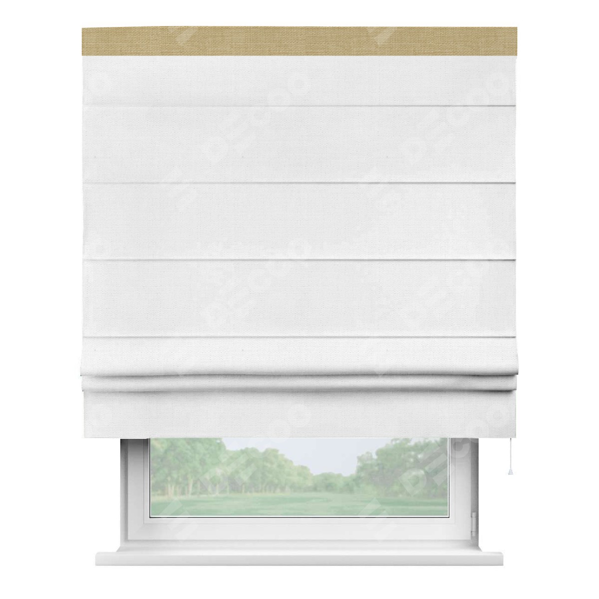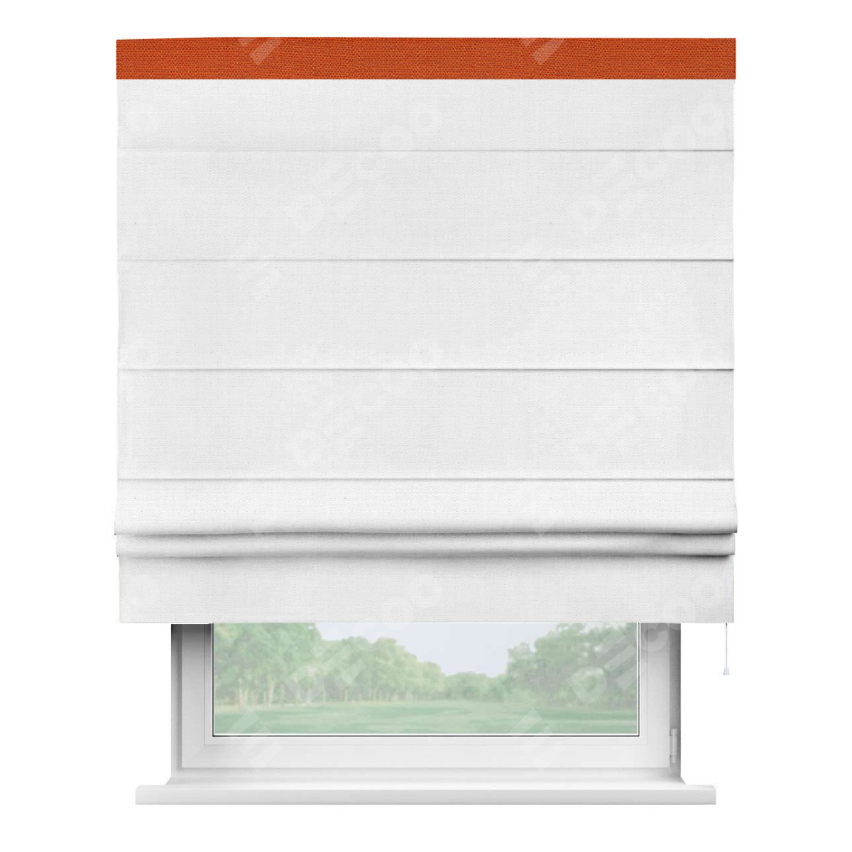 Римская штора производителя «Cortin», используется для проёма, пошита из ткани лён белый, артикул 53430. Отделка шторы кантом «Кинг», ткань для канта используется из льна разной расцветки на выбор. Имеет универсальный механизм и подходит для монтажа: на потолок, на стену и в нишу.