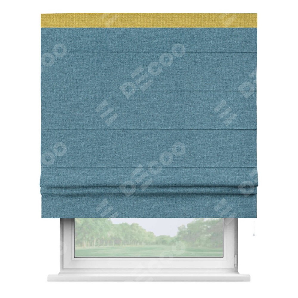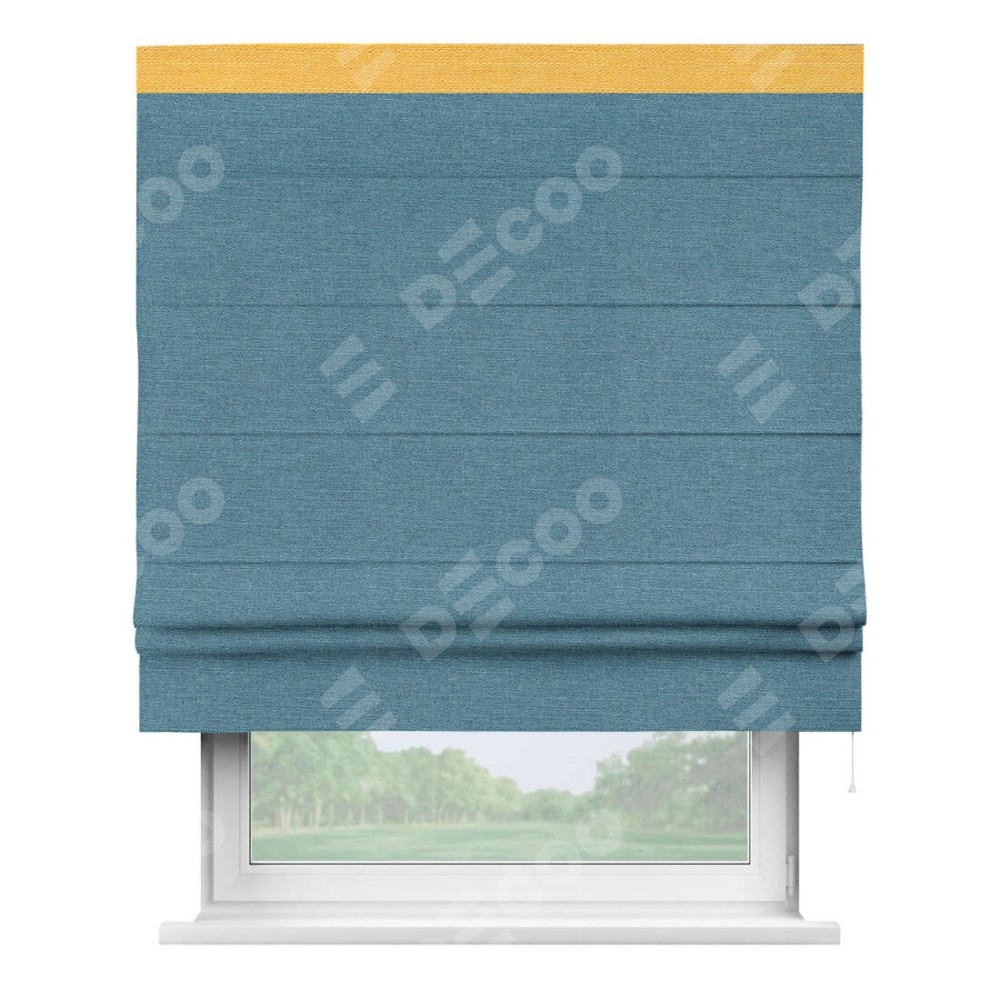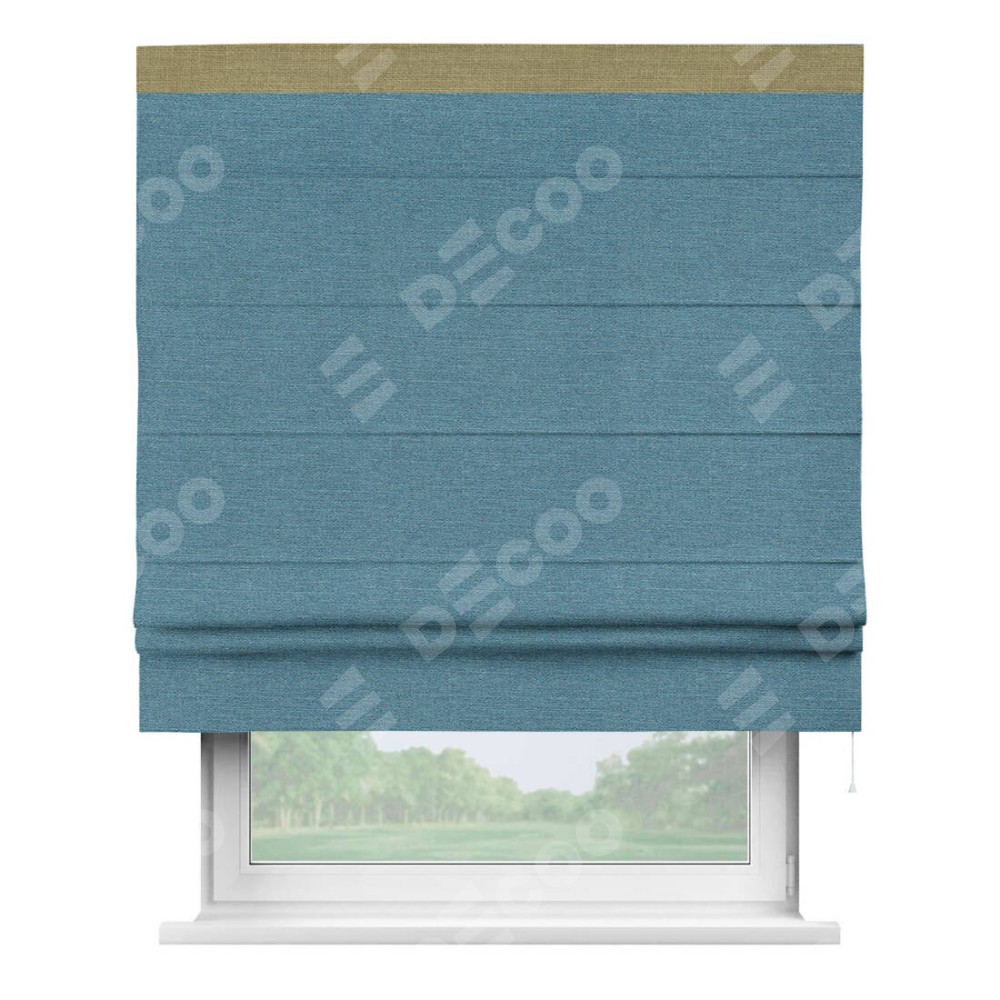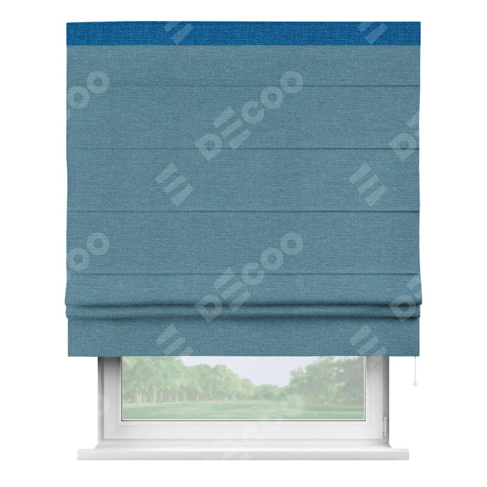 Римская штора производителя «Cortin», используется для проёма, пошита из ткани лён голубой, артикул 63741. Отделка шторы кантом «Кинг», ткань для канта используется из льна разной расцветки на выбор. Имеет универсальный механизм и подходит для монтажа: на потолок, на стену и в нишу.