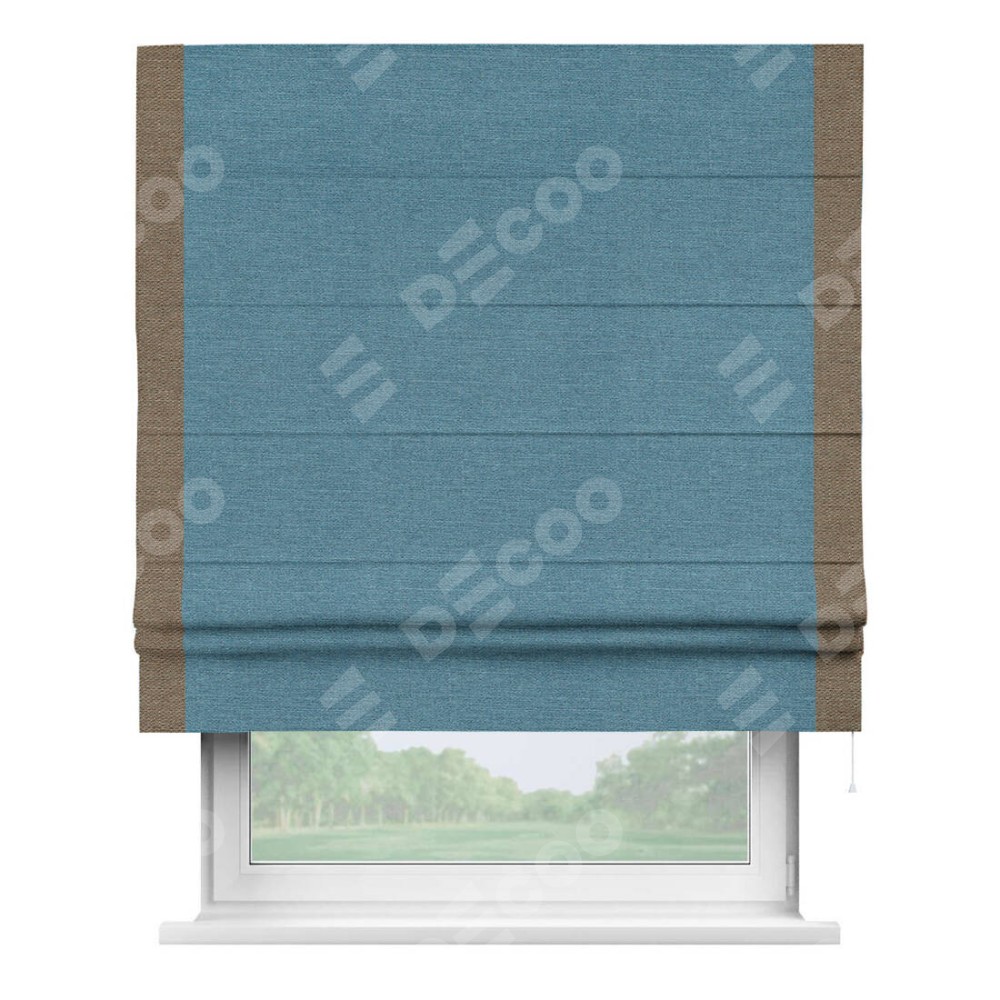 Римская штора производителя «Cortin», используется для проёма, пошита из ткани лён голубой, артикул 63741. Отделка шторы кантом «Стрим Дуо», ткань для канта используется из льна разной расцветки на выбор. Имеет универсальный механизм и подходит для монтажа: на потолок, на стену и в нишу.