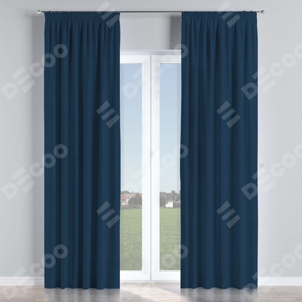 Комплект прямых штор, от производителя «Cortin», пошиты из ткани блэкаут однотонный синий, артикул ткани 29327. С изнаночной стороны в верхней части штор пристрачивается шторная лента с декоративными складками «Карандаш». Для создания элегантных складок прямые шторы шьются по стандарту с коэффициентом 1:2 (на 100 см. ширины проёма 200 см. ширины ткани).