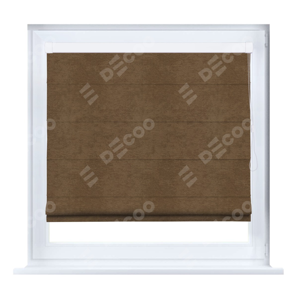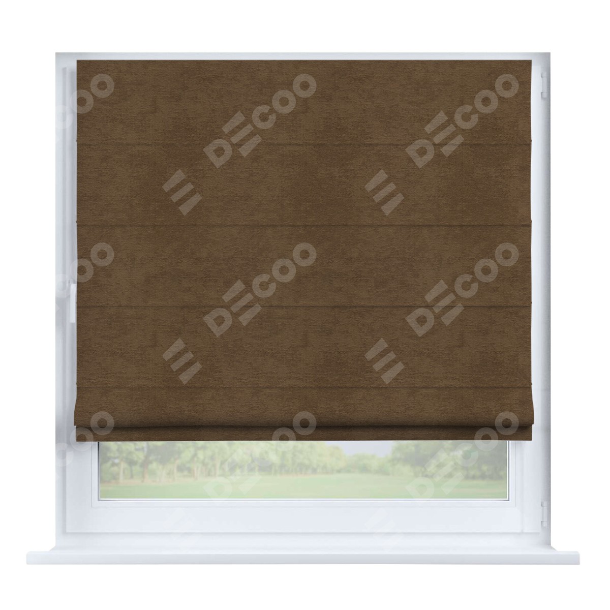 Римская штора производителя «Cortin», устанавливается на створку окна, пошита из ткани софт однотонный бронзовый, артикул 33099. Штора шьётся по индивидуальным размерам, для данного типа римской шторы возможная ширина от 35 до 150 см., высота до 250 см.
