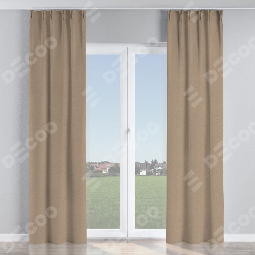 Комплект прямых штор, от производителя «Cortin», пошиты из ткани лён димаут светло-бежевый, артикул ткани 00002. С изнаночной стороны в верхней части штор пристрачивается шторная лента с декоративными складками «Кустик». Для создания элегантных складок прямые шторы шьются по стандарту с коэффициентом 1:2 (на 100 см. ширины проёма 200 см. ширины ткани).