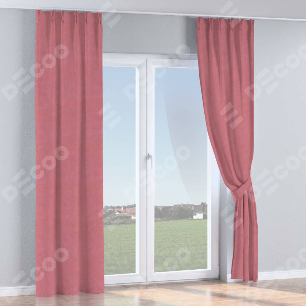Комплект прямых штор, от производителя «Cortin», пошиты из ткани вельвет брусника, артикул ткани 85550. С изнаночной стороны в верхней части штор пристрачивается шторная лента с декоративными складками «Кустик». Для создания элегантных складок прямые шторы шьются по стандарту с коэффициентом 1:2 (на 100 см. ширины проёма 200 см. ширины ткани).