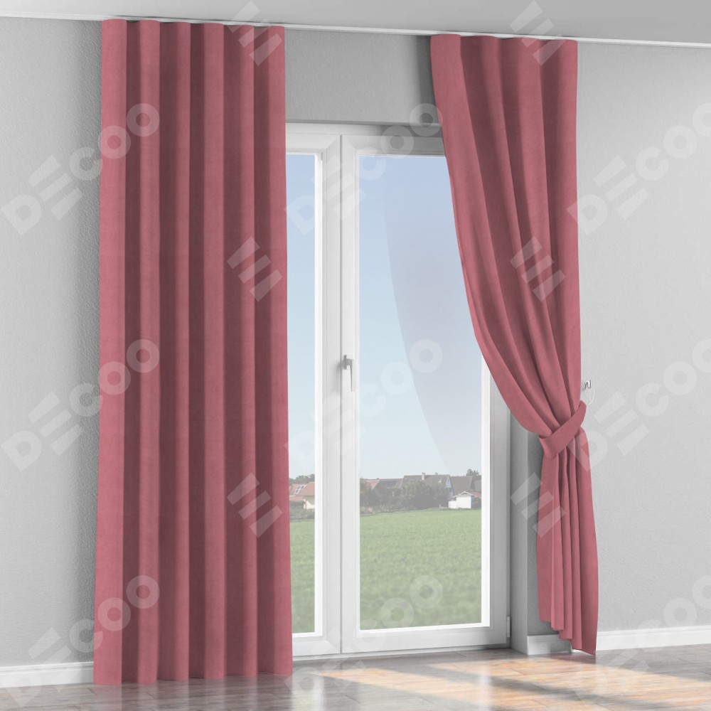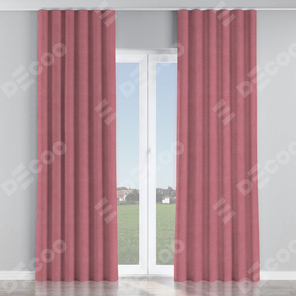Комплект прямых штор, от производителя «Cortin», пошиты из ткани вельвет брусника, артикул ткани 85550. С изнаночной стороны в верхней части штор пристрачивается шторная лента с декоративными складками «Волна». Для создания элегантных складок прямые шторы шьются по стандарту с коэффициентом 1:2 (на 100 см. ширины проёма 200 см. ширины ткани).