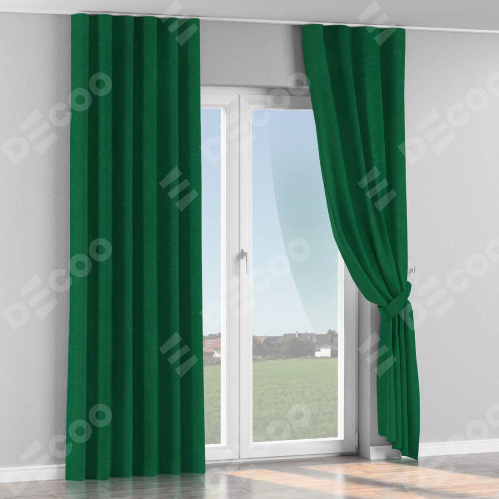 Комплект прямых штор, от производителя «Cortin», пошиты из ткани вельвет зелёный, артикул ткани 85546. С изнаночной стороны в верхней части штор пристрачивается шторная лента с декоративными складками «Волна». Для создания элегантных складок прямые шторы шьются по стандарту с коэффициентом 1:2 (на 100 см. ширины проёма 200 см. ширины ткани).