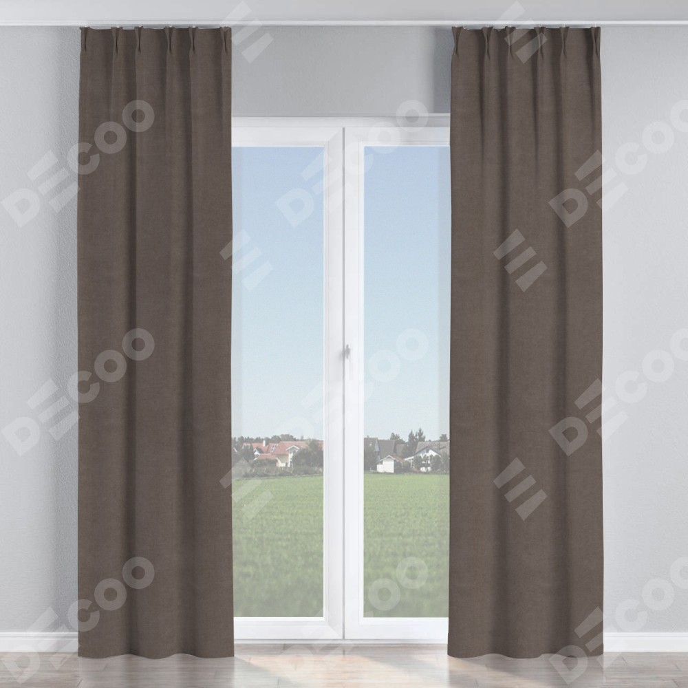 Комплект прямых штор, от производителя «Cortin», пошиты из ткани вельвет коричневый, артикул ткани 14135. С изнаночной стороны в верхней части штор пристрачивается шторная лента с декоративными складками «Кустик». Для создания элегантных складок прямые шторы шьются по стандарту с коэффициентом 1:2 (на 100 см. ширины проёма 200 см. ширины ткани).
