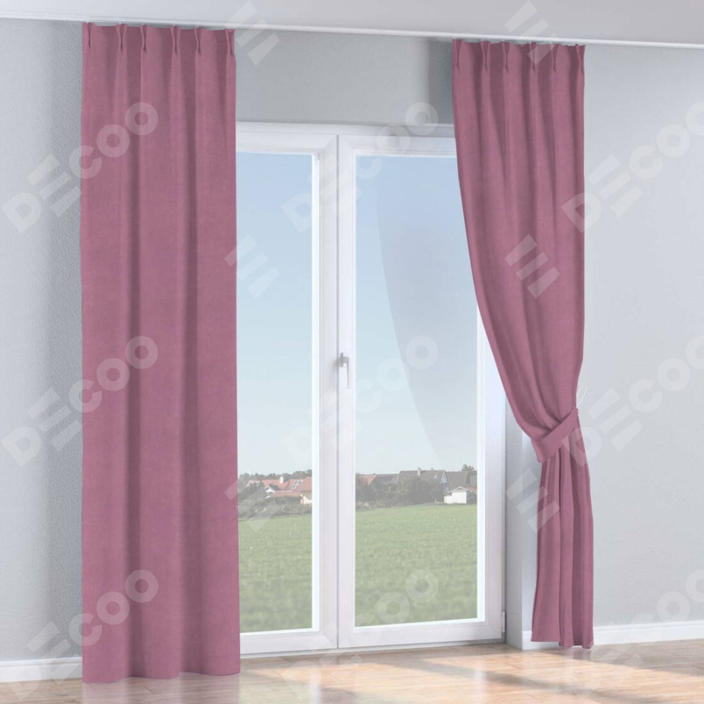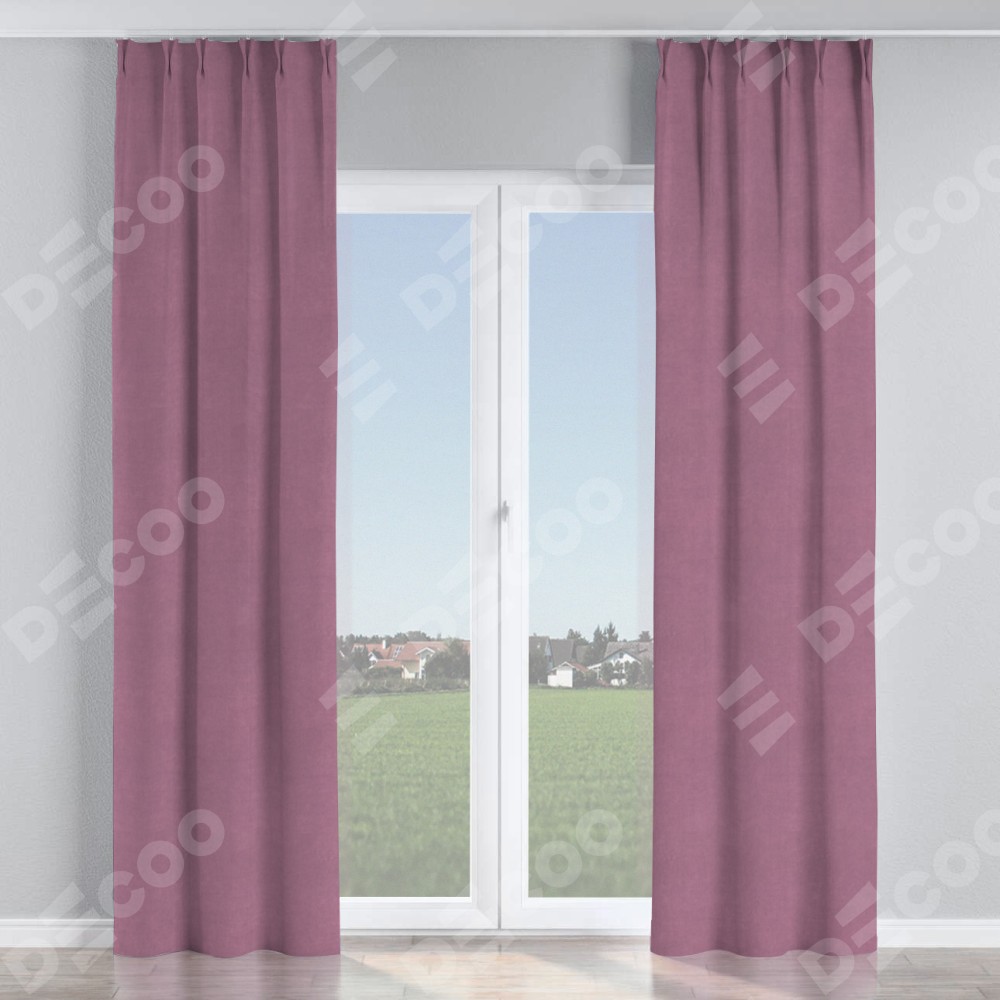 Комплект прямых штор, от производителя «Cortin», пошиты из ткани вельвет лиловый, артикул ткани 17752. С изнаночной стороны в верхней части штор пристрачивается шторная лента с декоративными складками «Кустик». Для создания элегантных складок прямые шторы шьются по стандарту с коэффициентом 1:2 (на 100 см. ширины проёма 200 см. ширины ткани).