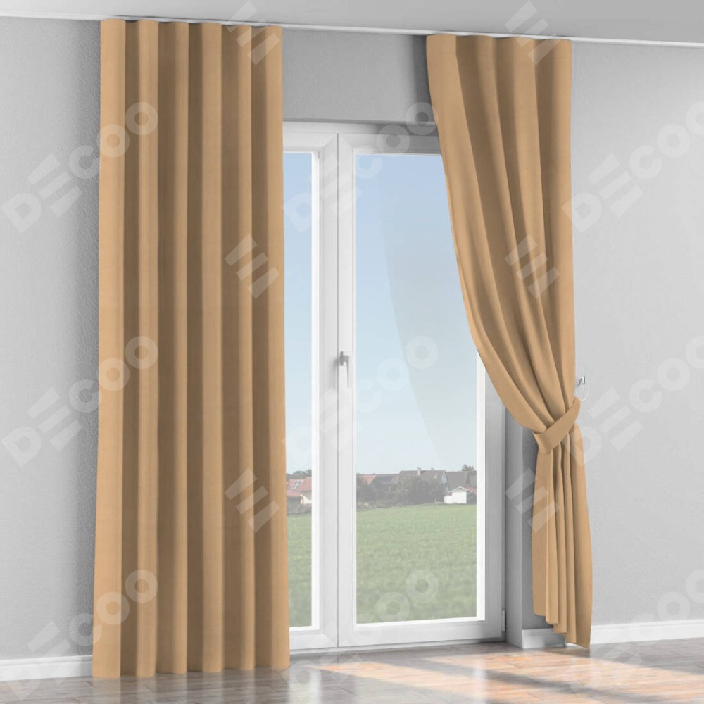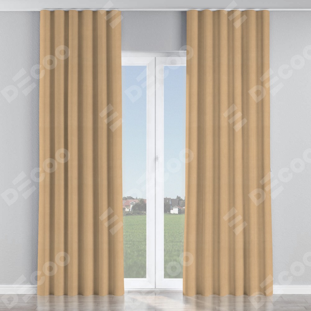 Комплект прямых штор, от производителя «Cortin», пошиты из ткани вельвет песочный, артикул ткани 17740. С изнаночной стороны в верхней части штор пристрачивается шторная лента с декоративными складками «Волна». Для создания элегантных складок прямые шторы шьются по стандарту с коэффициентом 1:2 (на 100 см. ширины проёма 200 см. ширины ткани).