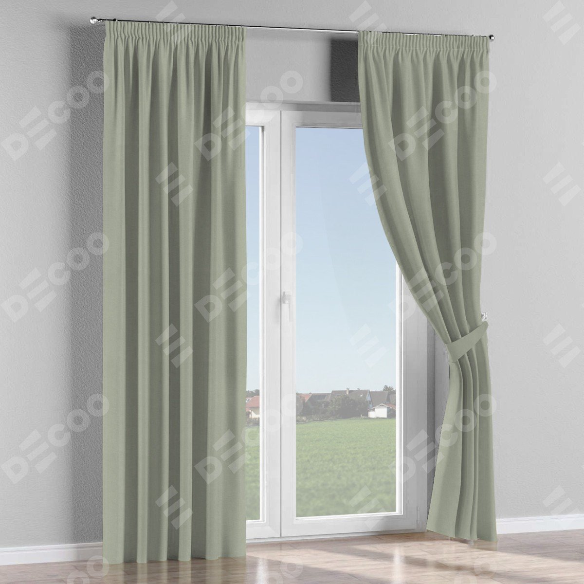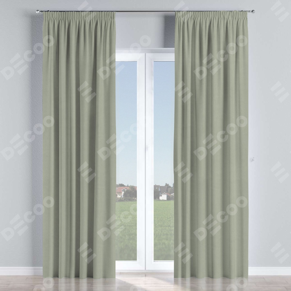 Комплект прямых штор, от производителя «Cortin», пошиты из ткани вельвет светло-серый, артикул ткани 30981. С изнаночной стороны в верхней части штор пристрачивается шторная лента с декоративными складками «Карандаш». Для создания элегантных складок прямые шторы шьются по стандарту с коэффициентом 1:2 (на 100 см. ширины проёма 200 см. ширины ткани).