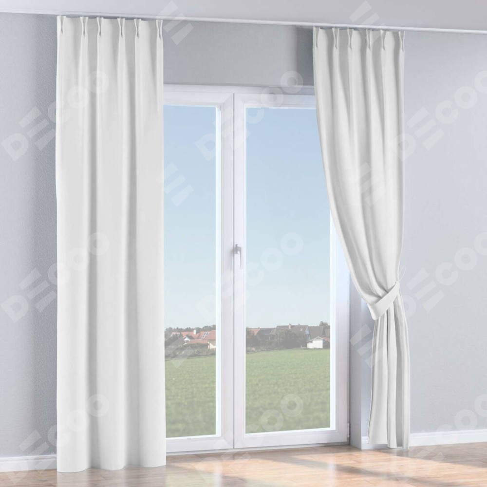 Комплект прямых штор, от производителя «Cortin», пошиты из ткани лён белый, артикул ткани 53430. С изнаночной стороны в верхней части штор пристрачивается шторная лента с декоративными складками «Кустик». Для создания элегантных складок прямые шторы шьются по стандарту с коэффициентом 1:2 (на 100 см. ширины проёма 200 см. ширины ткани).