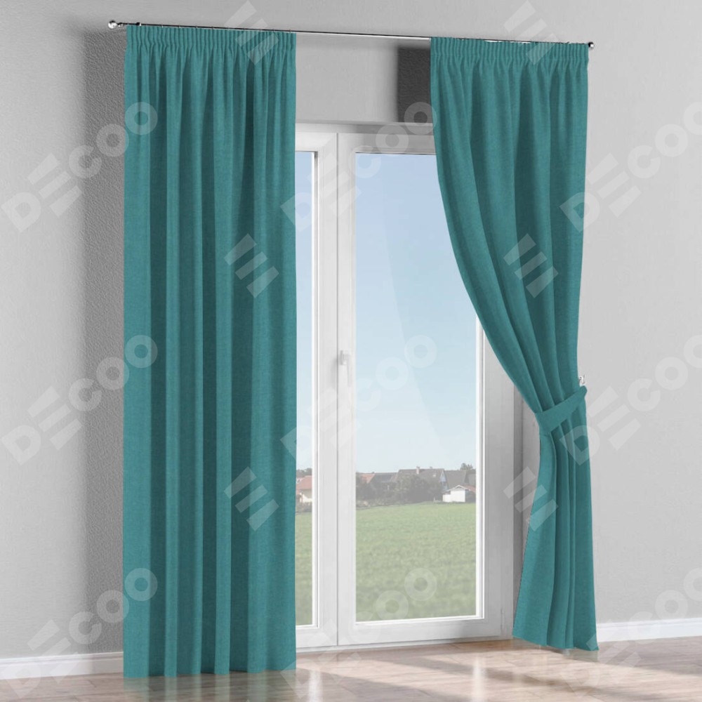 Комплект прямых штор, от производителя «Cortin», пошиты из ткани лён бирюзовый, артикул ткани 53436. С изнаночной стороны в верхней части штор пристрачивается шторная лента с декоративными складками «Карандаш». Для создания элегантных складок прямые шторы шьются по стандарту с коэффициентом 1:2 (на 100 см. ширины проёма 200 см. ширины ткани).