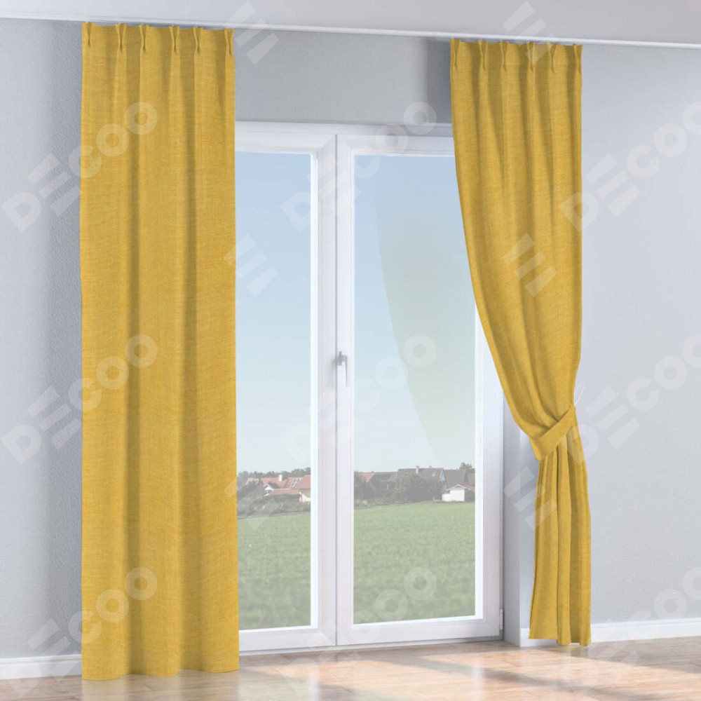 Комплект прямых штор, от производителя «Cortin», пошиты из ткани лён горчичный, артикул ткани 74740. С изнаночной стороны в верхней части штор пристрачивается шторная лента с декоративными складками «Кустик». Для создания элегантных складок прямые шторы шьются по стандарту с коэффициентом 1:2 (на 100 см. ширины проёма 200 см. ширины ткани).