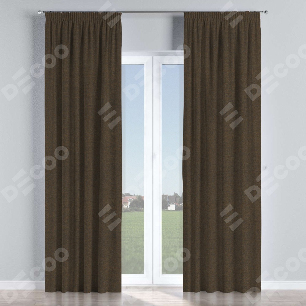 Комплект прямых штор, от производителя «Cortin», пошиты из ткани лён тёмно-коричневый, артикул ткани 53444. С изнаночной стороны в верхней части штор пристрачивается шторная лента с декоративными складками «Карандаш». Для создания элегантных складок прямые шторы шьются по стандарту с коэффициентом 1:2 (на 100 см. ширины проёма 200 см. ширины ткани).