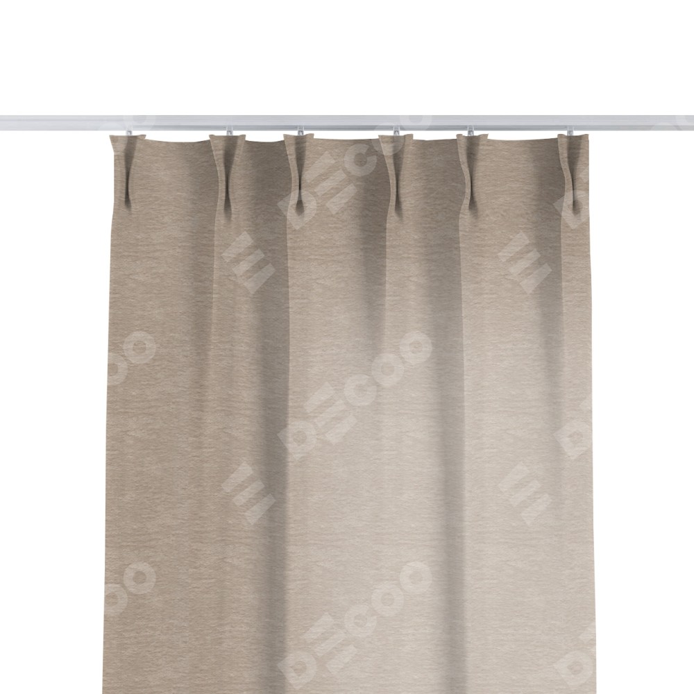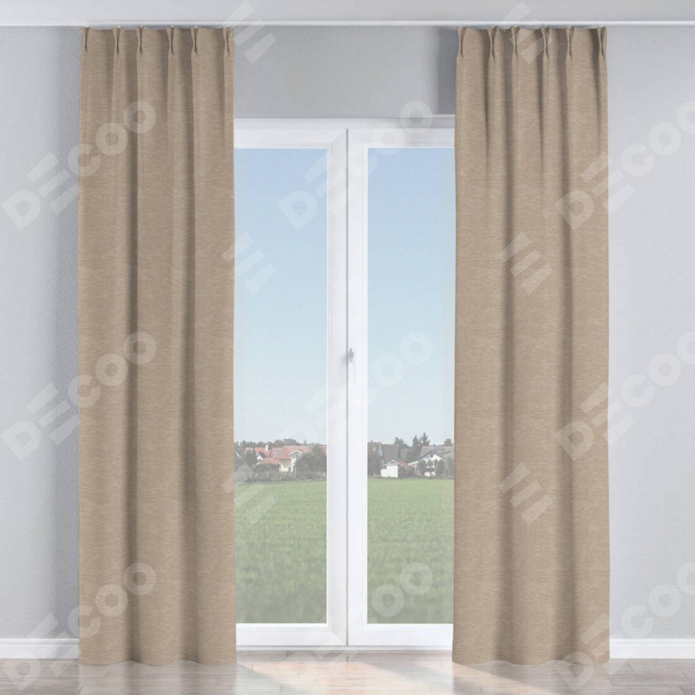 Комплект прямых штор, от производителя «Cortin», пошиты из ткани софт однотонный тёмно-бежевый, артикул ткани 1640. С изнаночной стороны в верхней части штор пристрачивается шторная лента с декоративными складками «Кустик». Для создания элегантных складок прямые шторы шьются по стандарту с коэффициентом 1:2 (на 100 см. ширины проёма 200 см. ширины ткани).