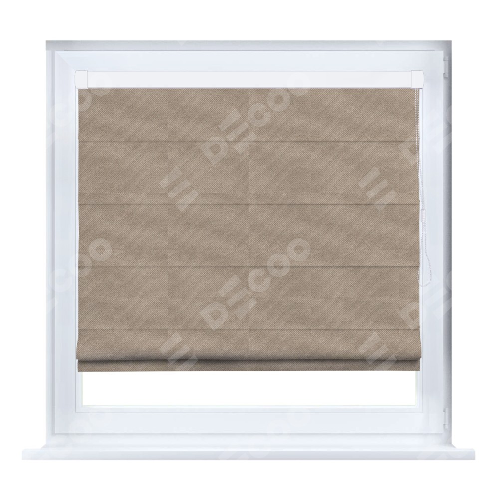 Римская штора кассетного типа, производителя «Cortin», устанавливается только на пластиковые окна и прилегает к стеклопакету, пошита из ткани лён димаут светло-бежевый, артикул 00002.