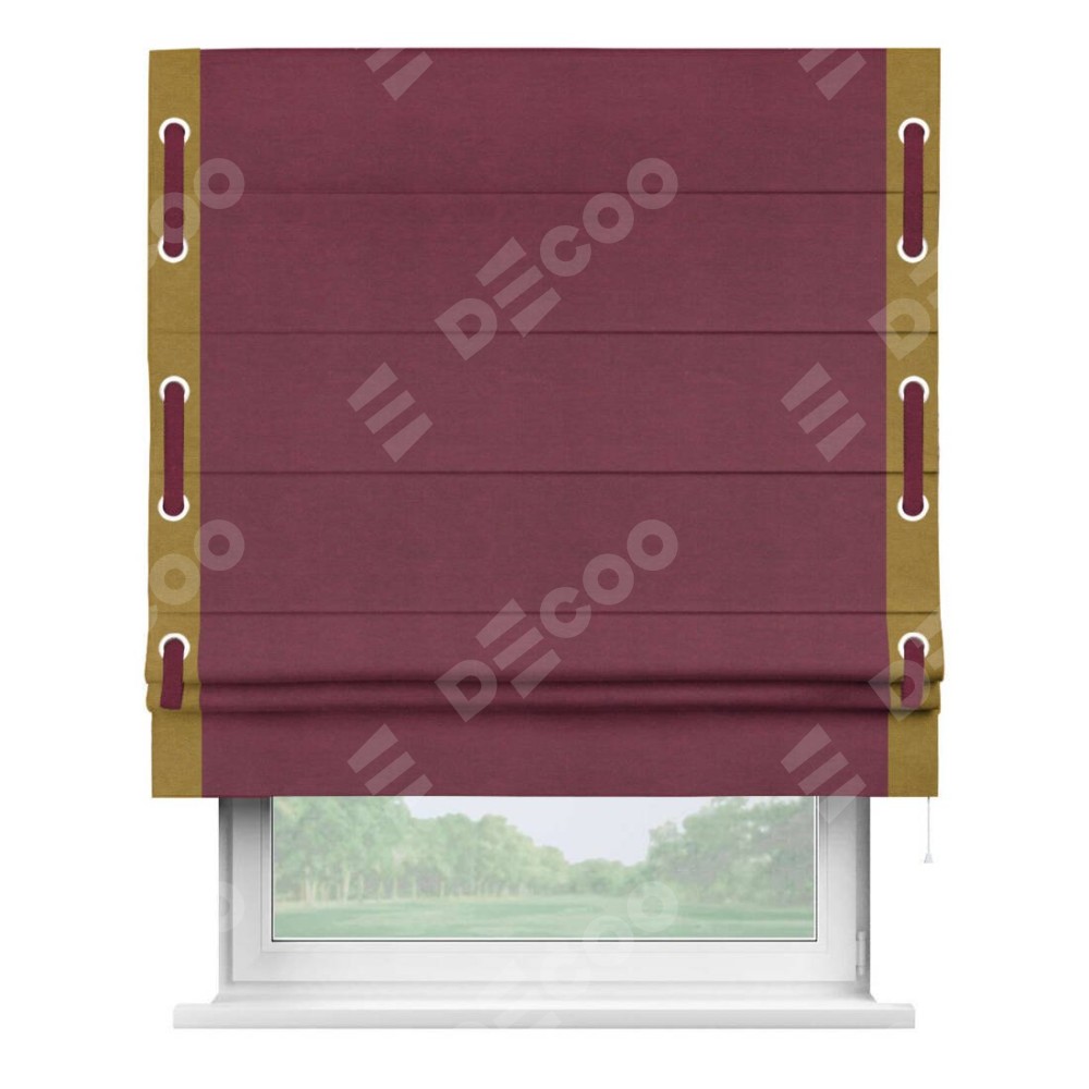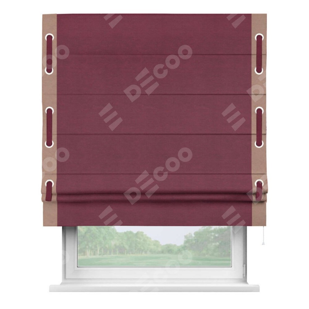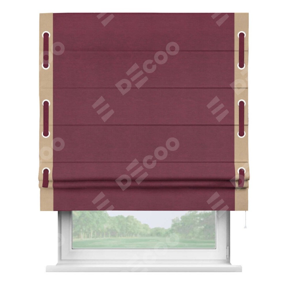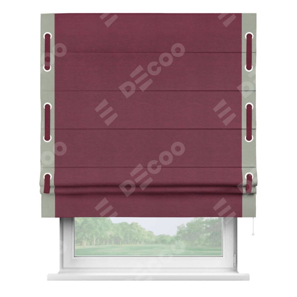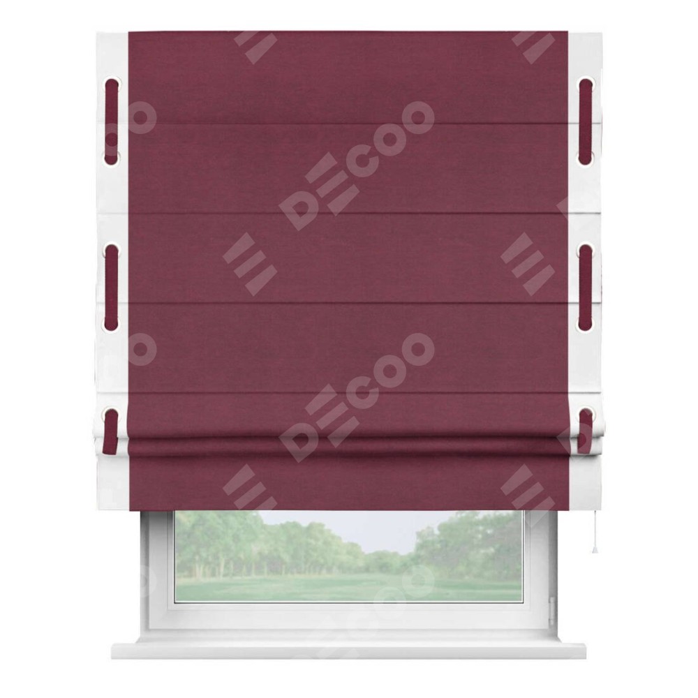 Римская штора производителя «Cortin», используется для проёма, пошита из ткани вельвет бордовый, артикул ткани 85553. Отделка шторы кантом «Стрим Дуо» на кантах расположены люверсы с пояском, ткань для канта используется из вельвета разной расцветки на выбор. Ткань для пояска обычно используется из основной ткани шторы, а так же можно сделать из любой расцветки по желанию. Имеет универсальный механизм и подходит для монтажа: на потолок, на стену и в нишу.