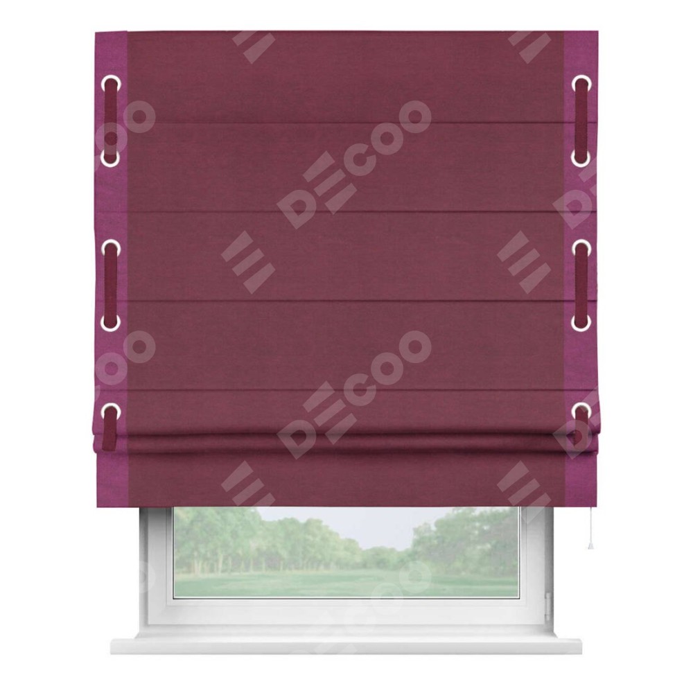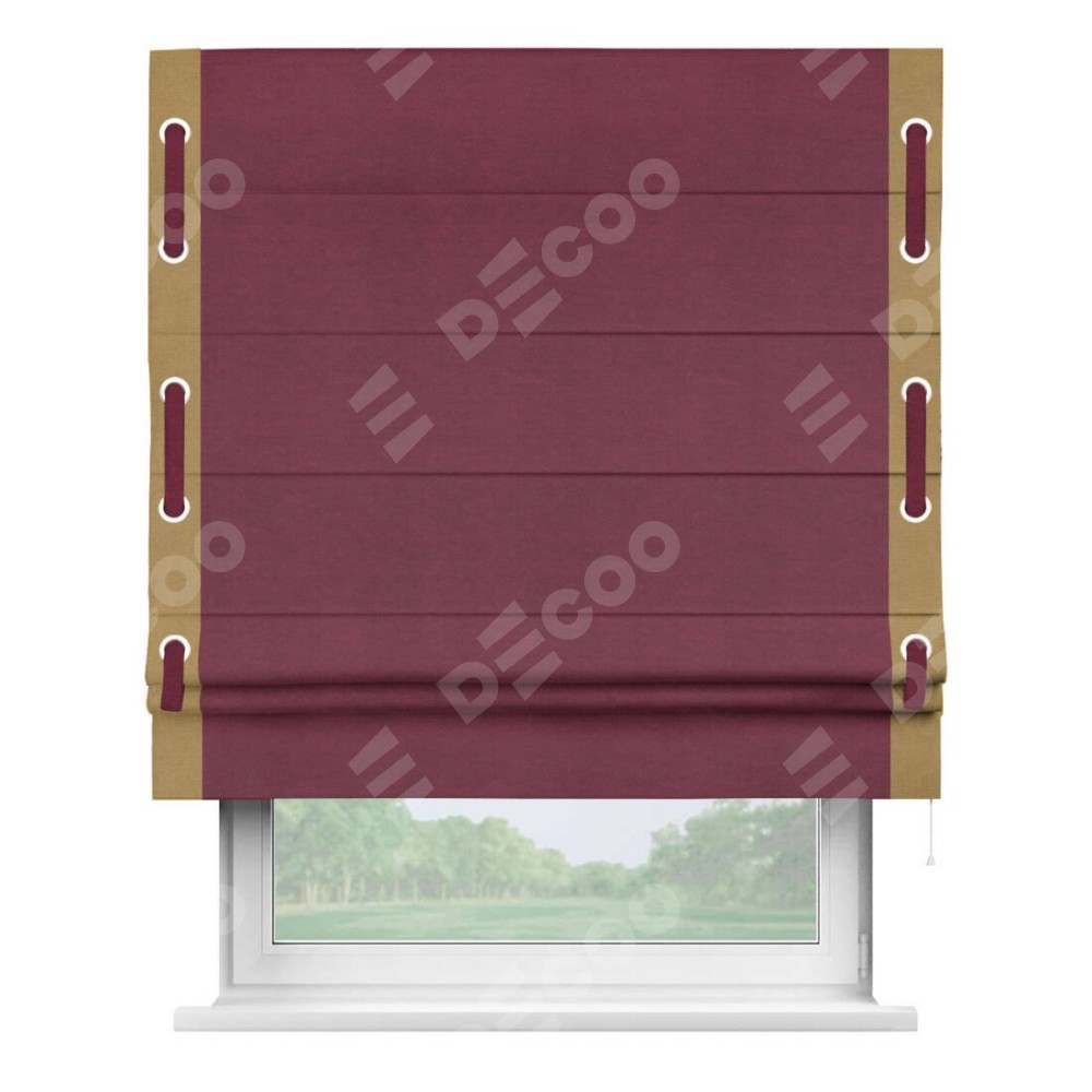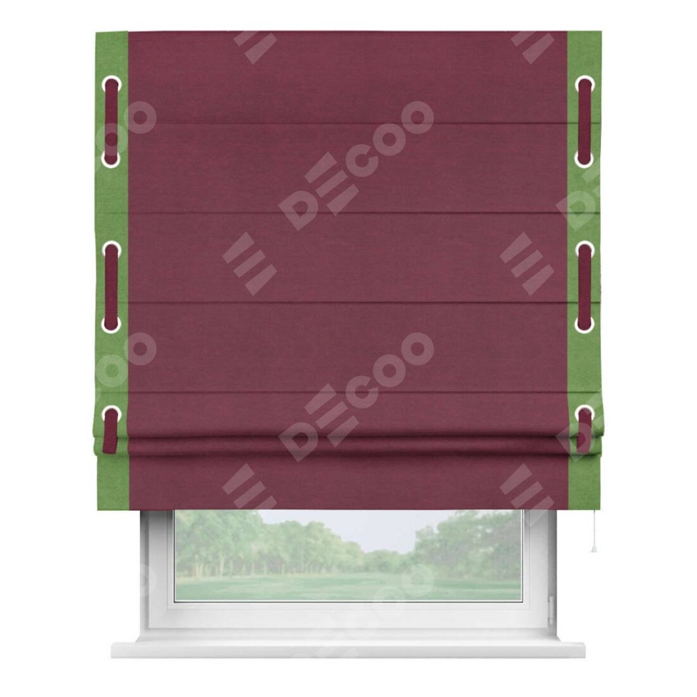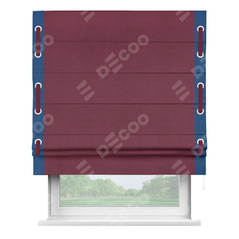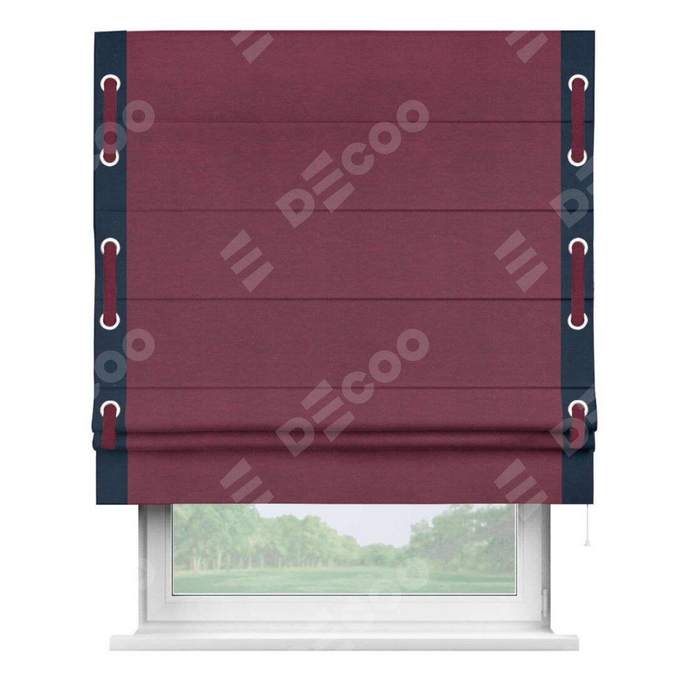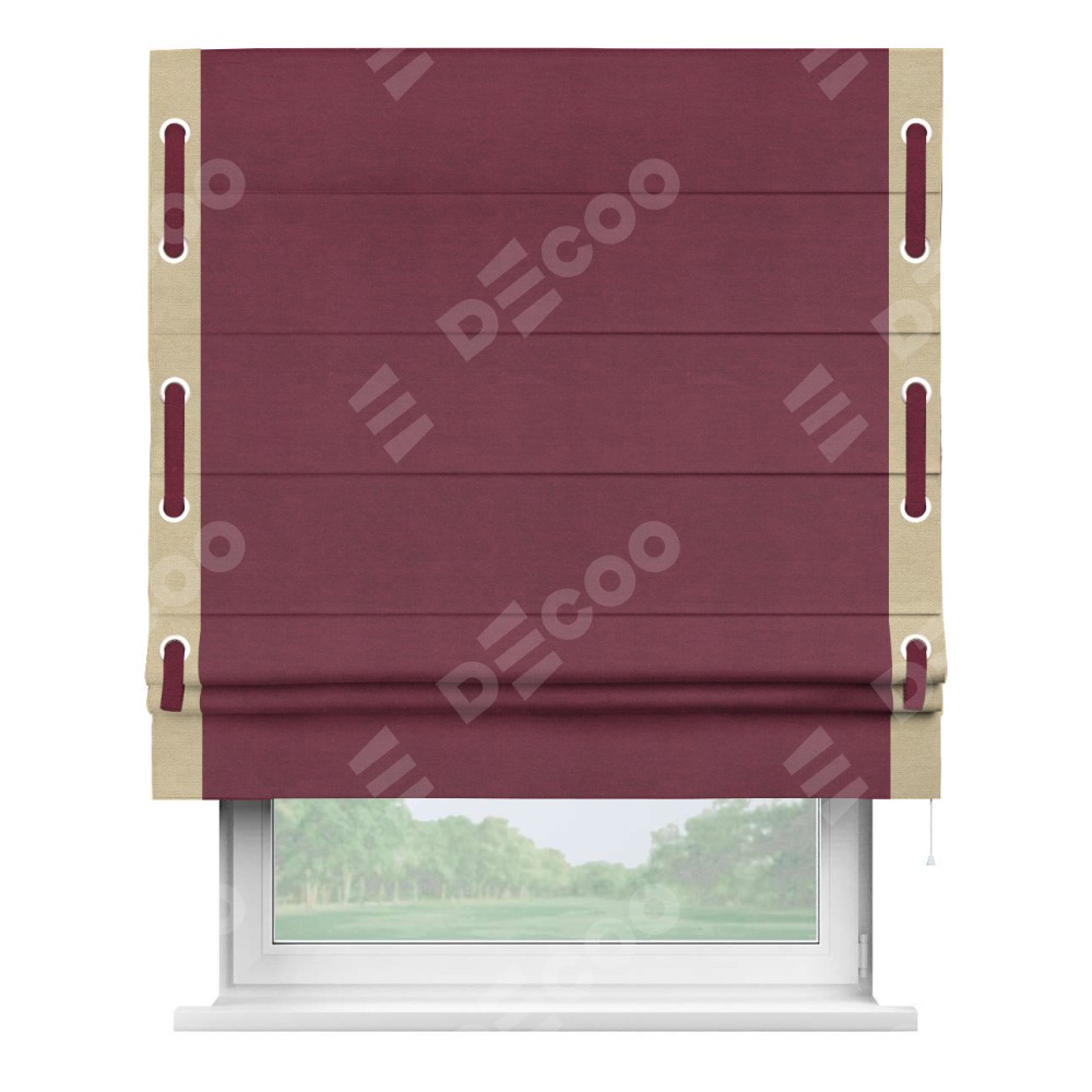 Римская штора производителя «Cortin», используется для проёма, пошита из ткани вельвет бордовый, артикул ткани 85553. Отделка шторы кантом «Стрим Дуо» на кантах расположены люверсы с пояском, ткань для канта используется из вельвета разной расцветки на выбор. Ткань для пояска обычно используется из основной ткани шторы, а так же можно сделать из любой расцветки по желанию. Имеет универсальный механизм и подходит для монтажа: на потолок, на стену и в нишу.