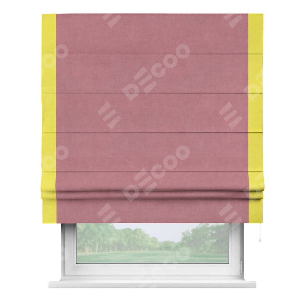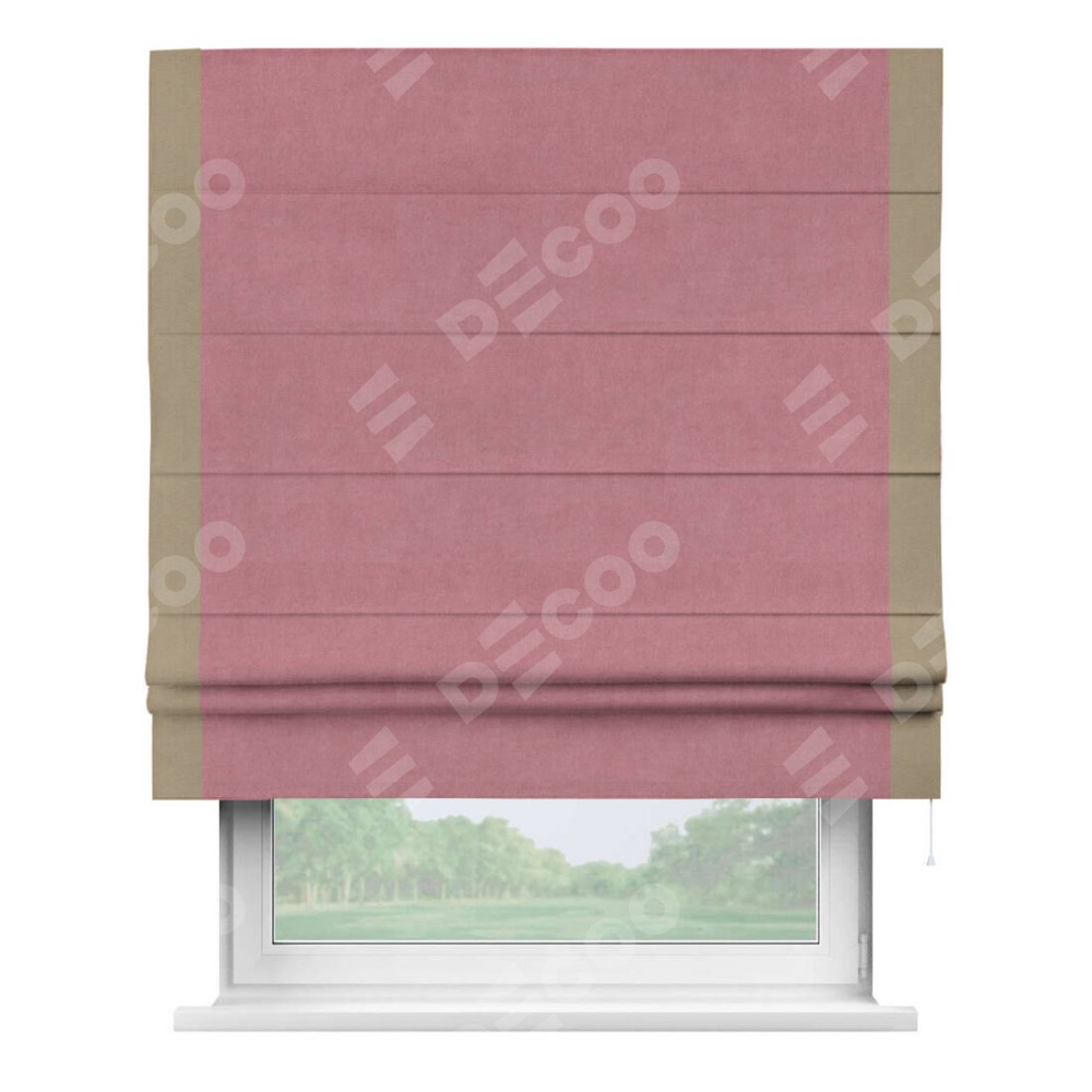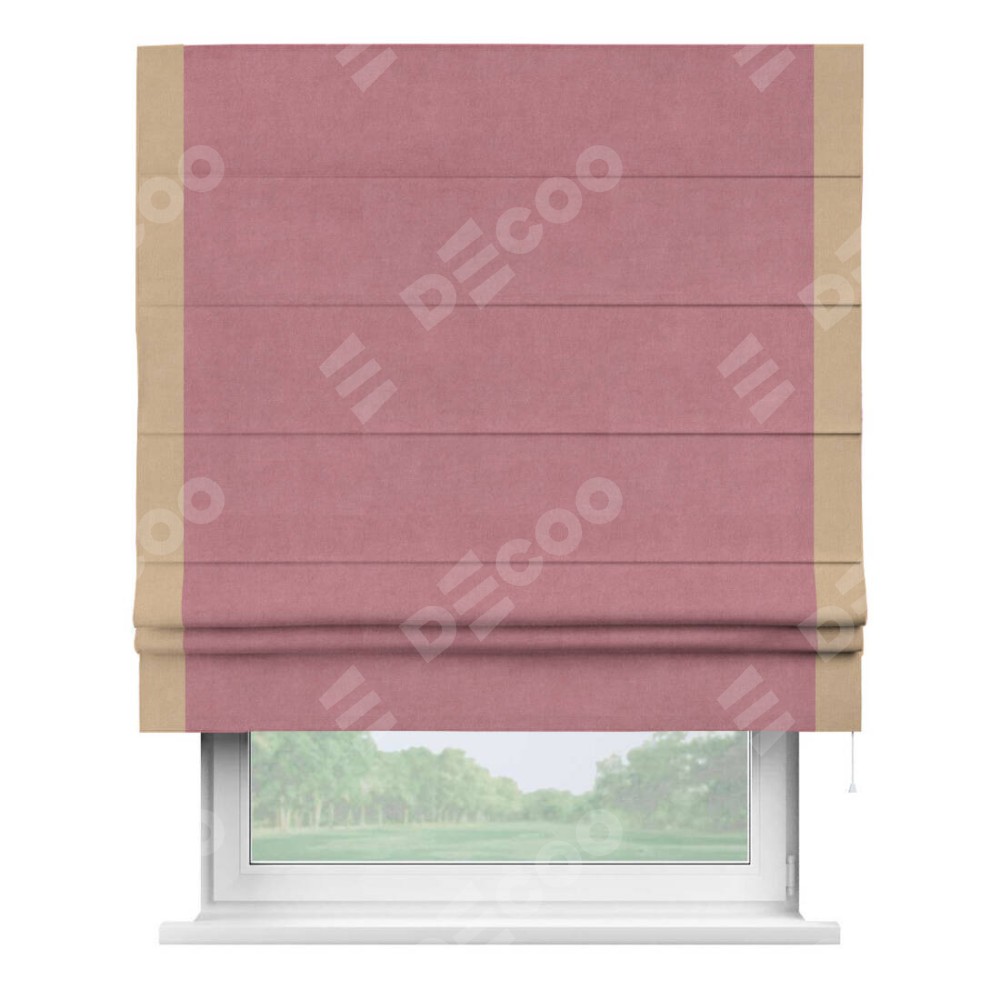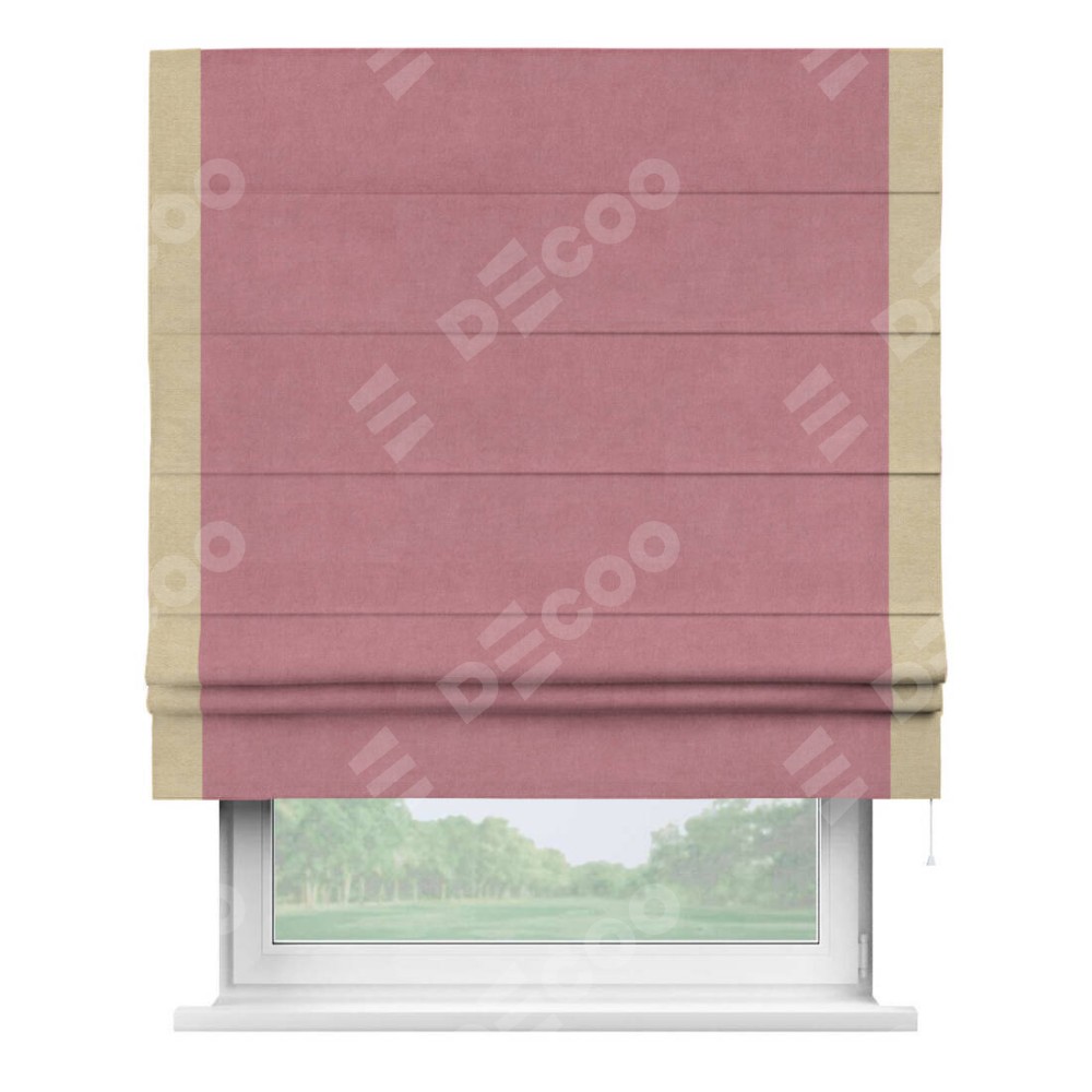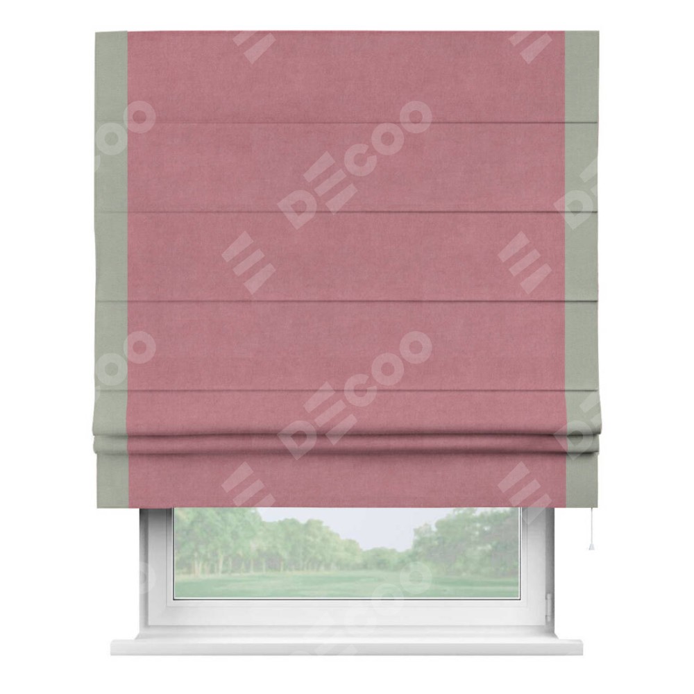 Римская штора производителя «Cortin», используется для проёма, пошита из ткани вельвет брусника, артикул ткани 85550. Отделка шторы кантом «Стрим Дуо», ткань для канта используется из вельвета разной расцветки на выбор. Имеет универсальный механизм и подходит для монтажа: на потолок, на стену и в нишу.