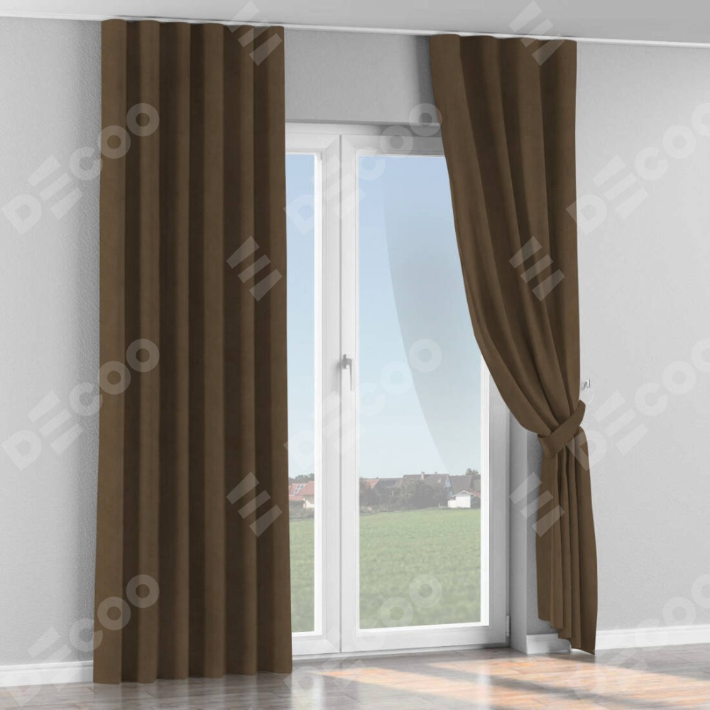 Комплект прямых штор, от производителя «Cortin», пошиты из ткани бархат тёмно-коричневый, артикул ткани 5017. С изнаночной стороны в верхней части штор пристрачивается шторная лента с декоративными складками «Волна». Для создания элегантных складок прямые шторы шьются по стандарту с коэффициентом 1:2 (на 100 см. ширины проёма 200 см. ширины ткани).