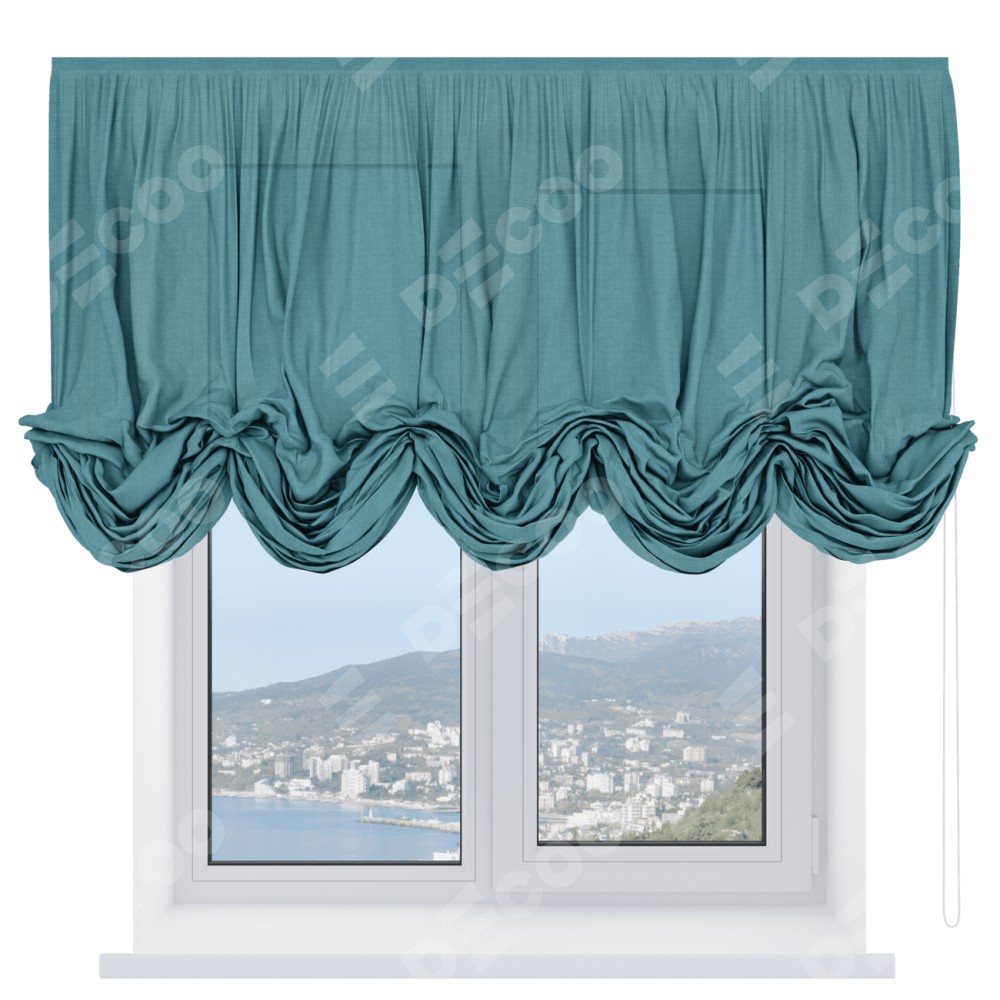 Австрийская штора производителя «Cortin», используется для проёма, пошита из ткани лён бирюза, артикул ткани 7446. Имеет универсальный механизм и подходит для монтажа: на потолок и на стену.