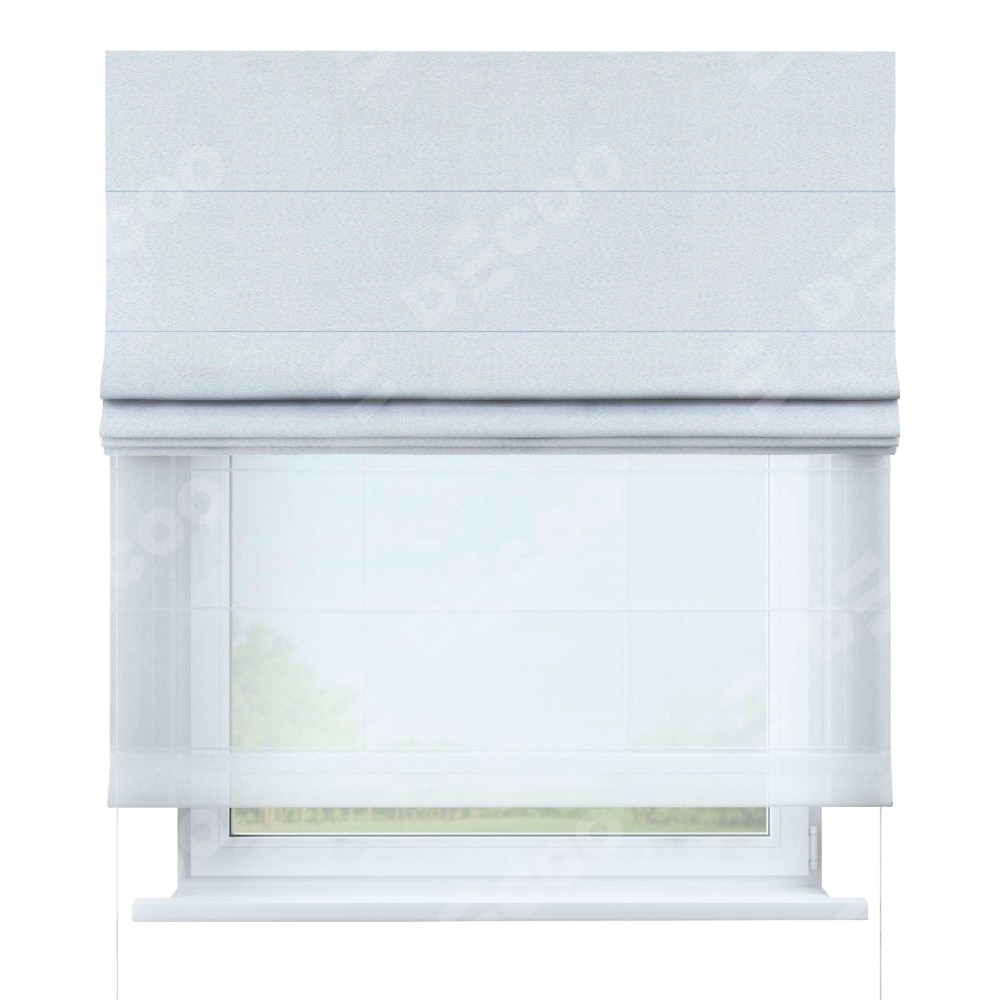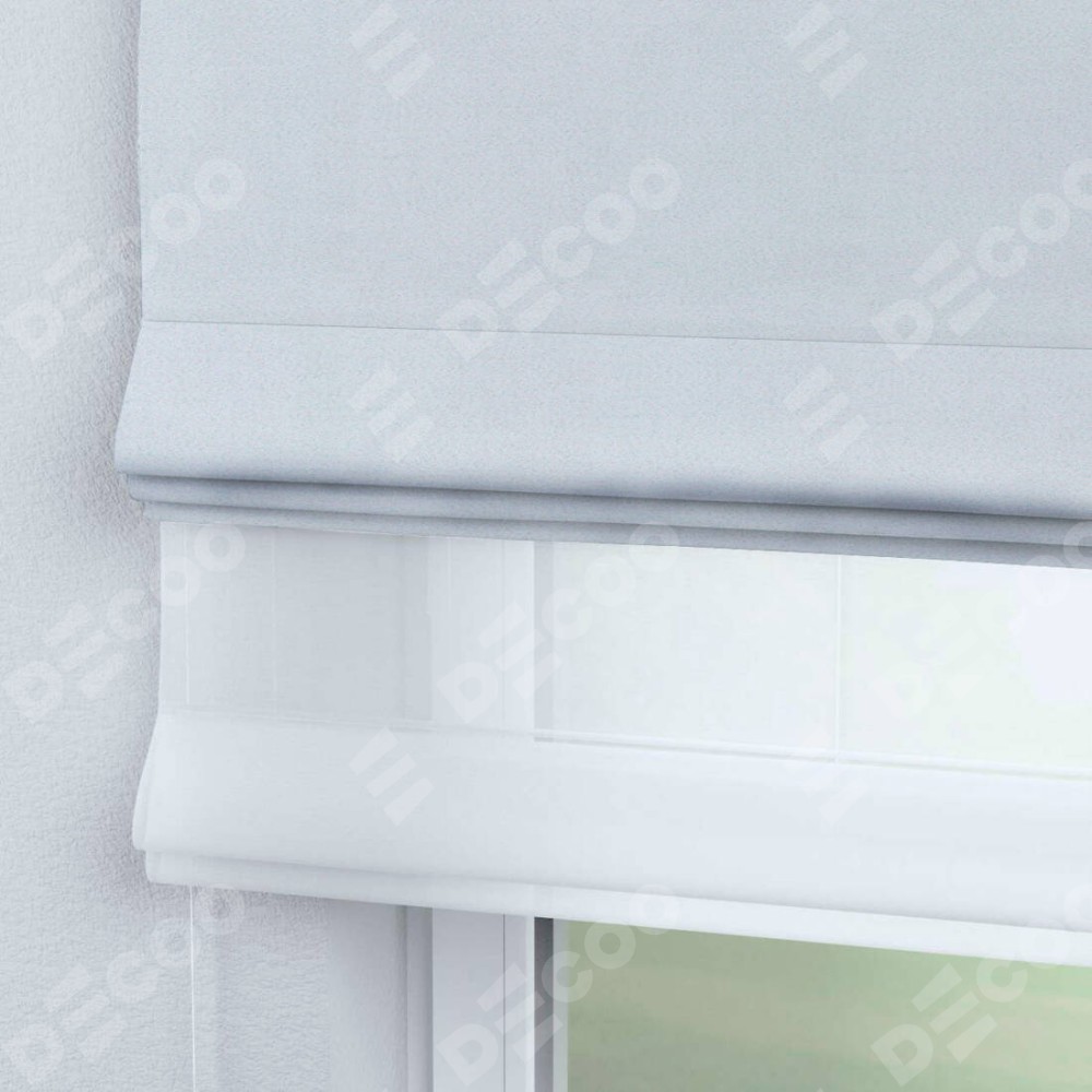 Римская штора день-ночь производителя «Cortin», используется для проёма, пошита из двух полотен, с лицевой стороны блэкаут однотонный дымчато-белый артикул 101, вторая ткань тюль (по стандарту комплектуется тюль белого цвета артикул V-01). Имеет универсальный механизм и подходит для монтажа: на потолок, на стену и в нишу.