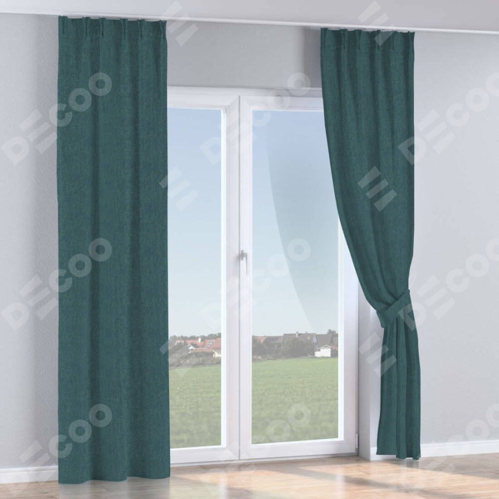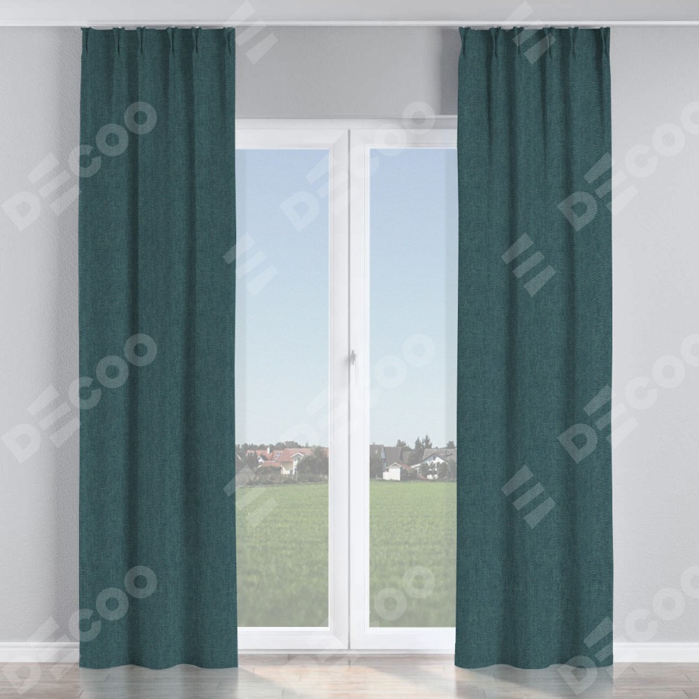 Комплект прямых штор, от производителя «Cortin», пошиты из ткани лён димаут серо-синий, артикул ткани 03238. С изнаночной стороны в верхней части штор пристрачивается шторная лента с декоративными складками «Кустик». Для создания элегантных складок прямые шторы шьются по стандарту с коэффициентом 1:2 (на 100 см. ширины проёма 200 см. ширины ткани).