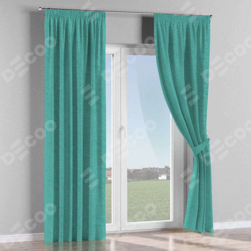 Комплект прямых штор, от производителя «Cortin», пошиты из ткани лён изумрудный, артикул ткани 85908. С изнаночной стороны в верхней части штор пристрачивается шторная лента с декоративными складками «Карандаш». Для создания элегантных складок прямые шторы шьются по стандарту с коэффициентом 1:2 (на 100 см. ширины проёма 200 см. ширины ткани).