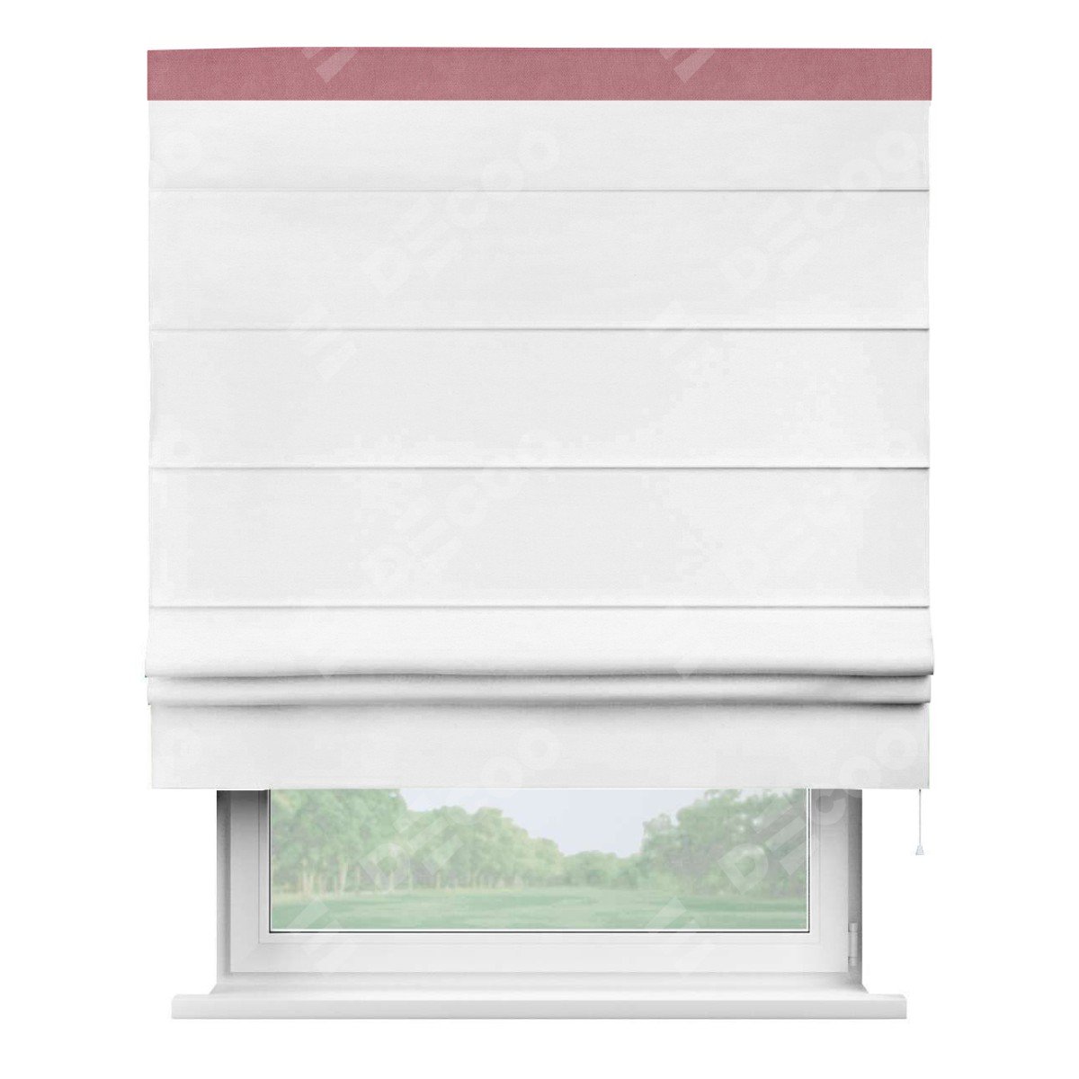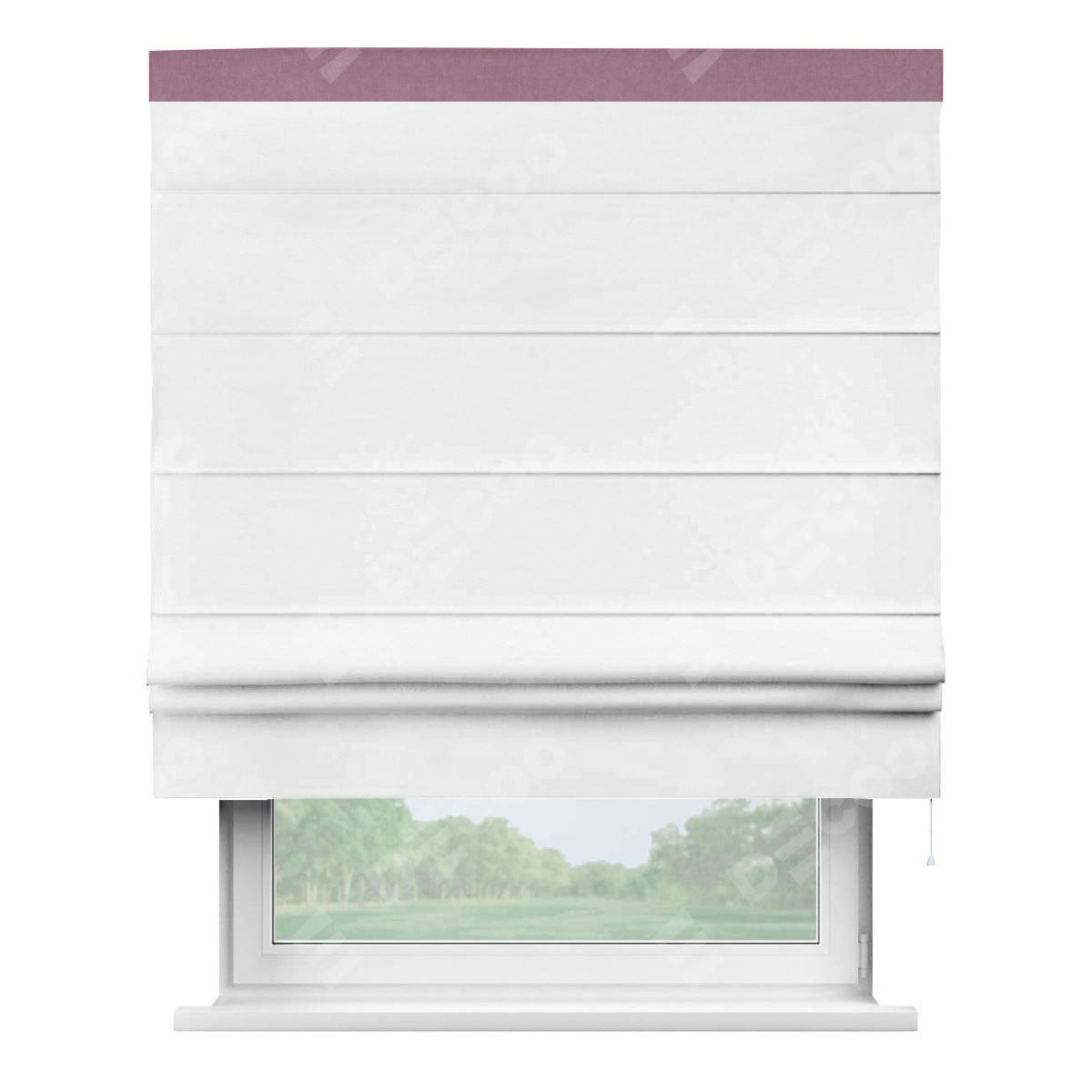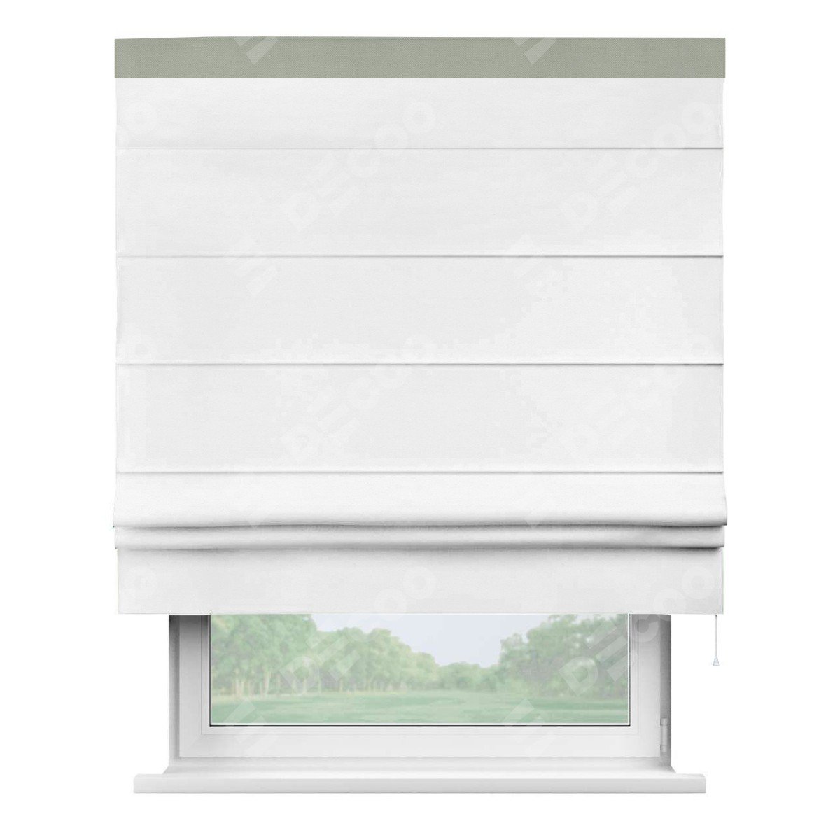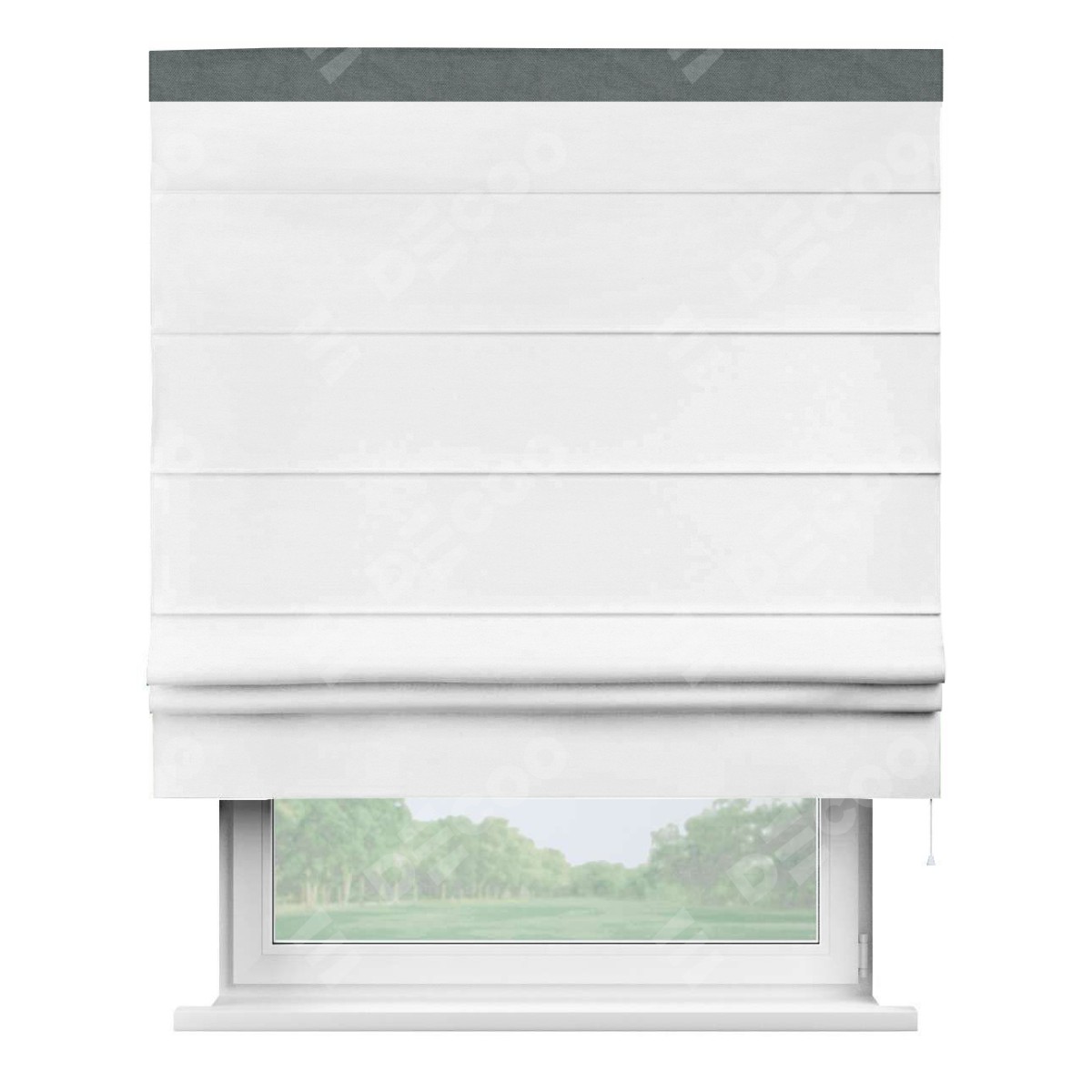 Римская штора производителя «Cortin», используется для проёма, пошита из ткани вельвет дымчато-белый, артикул ткани 85535. Отделка шторы кантом «Кинг», ткань для канта используется из вельвета разной расцветки на выбор. Имеет универсальный механизм и подходит для монтажа: на потолок, на стену и в нишу.