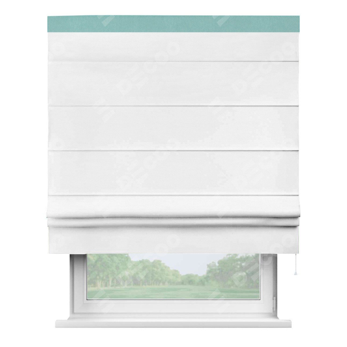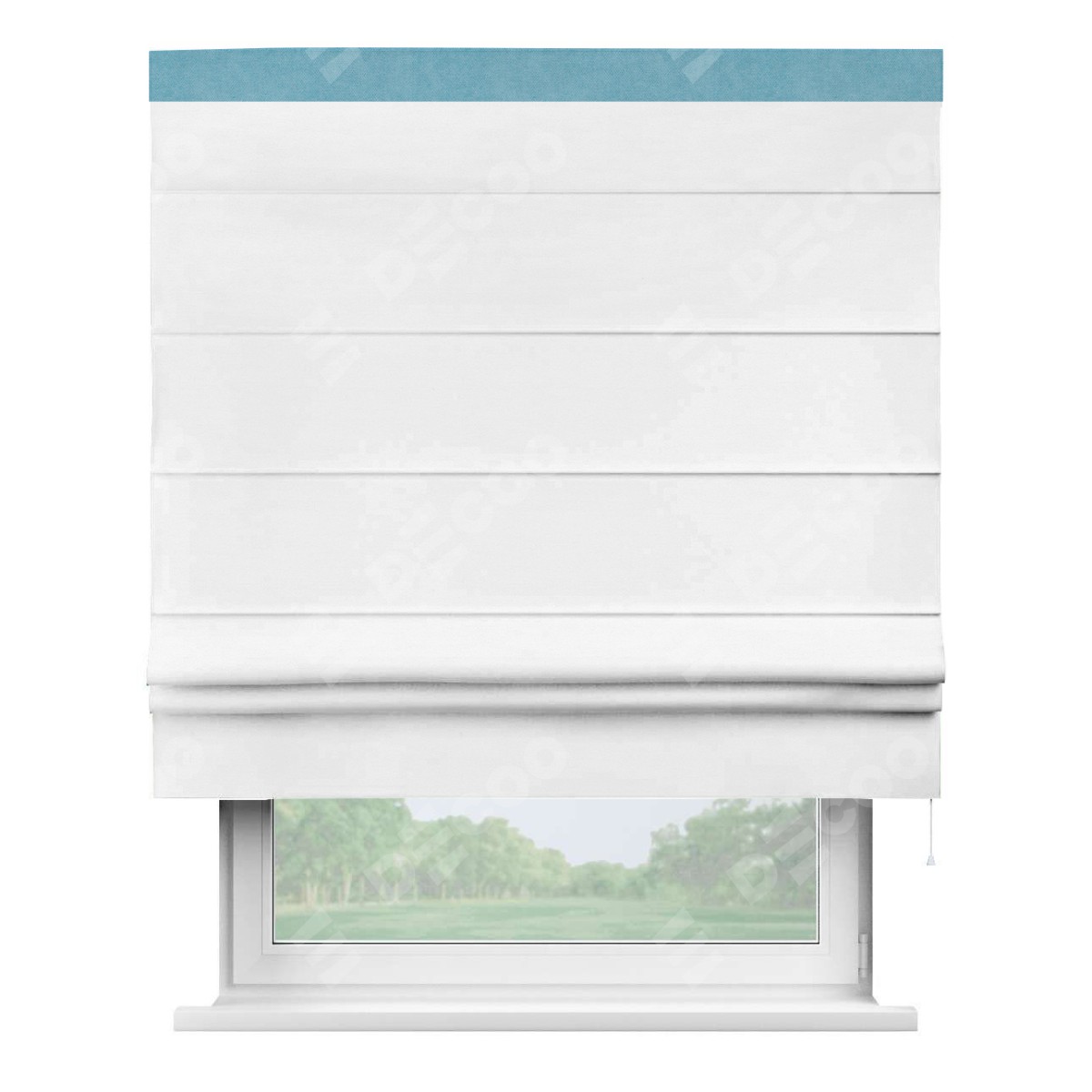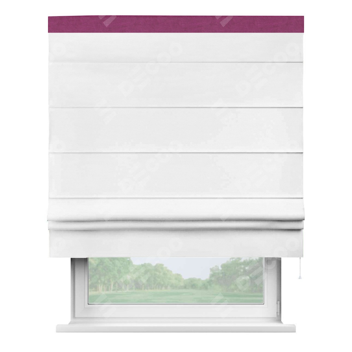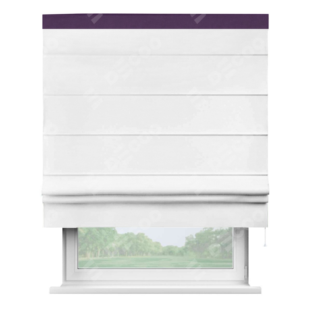 Римская штора производителя «Cortin», используется для проёма, пошита из ткани вельвет дымчато-белый, артикул ткани 85535. Отделка шторы кантом «Кинг», ткань для канта используется из вельвета разной расцветки на выбор. Имеет универсальный механизм и подходит для монтажа: на потолок, на стену и в нишу.