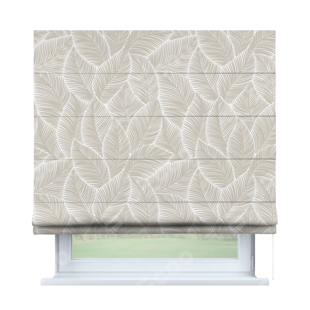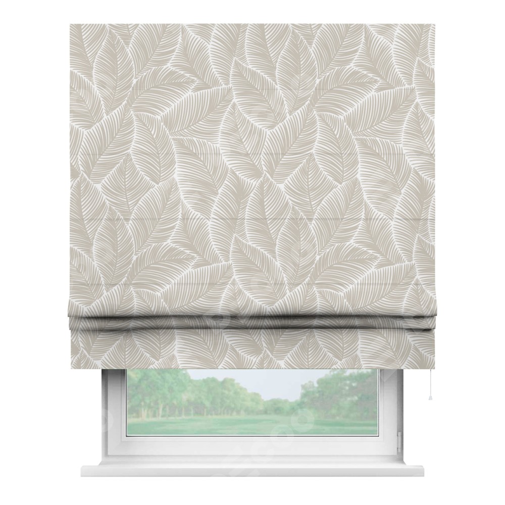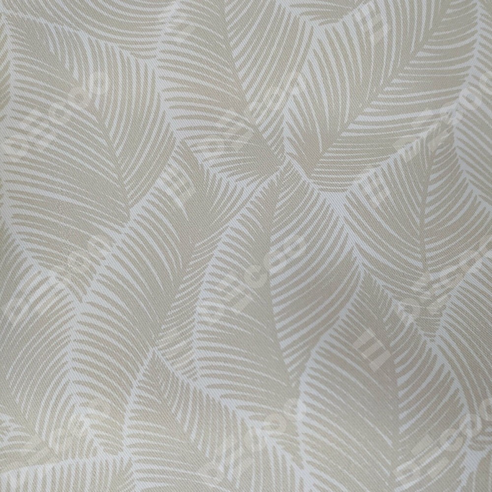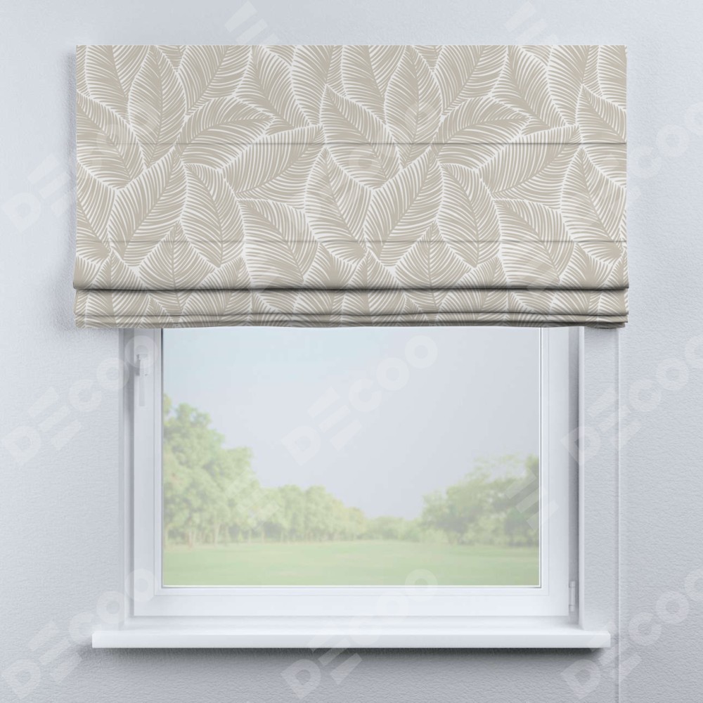 Римская штора производителя «Cortin», используется для проёма, пошита из ткани блэкаут с нанесением сублимационной печати «Бежевые листья». Имеет универсальный механизм и подходит для монтажа: на потолок, на стену и в нишу.