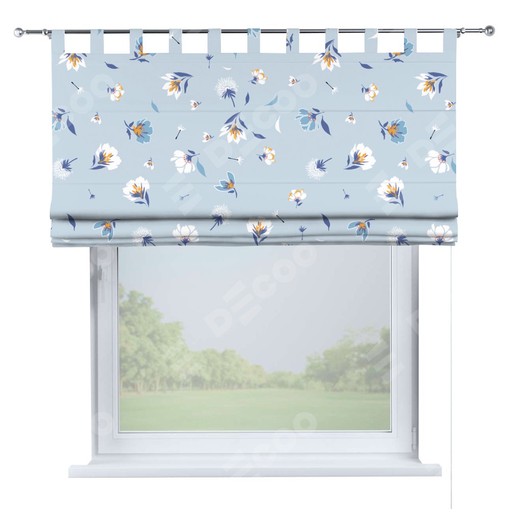 Римская штора производителя «Cortin», используется для проёма, пошита из ткани блэкаут с нанесением сублимационной печати «Голубые цветы». Данная модель пошита на петлях, комплектуется на выбор круглым карнизом и подходит для монтажа на стену. Римская штора на петлях имеет простую систему регулировки высоты, отличительным преимуществом данной модели является простой способ монтажа. Достаточно повесить ее на трубу и штора готова!