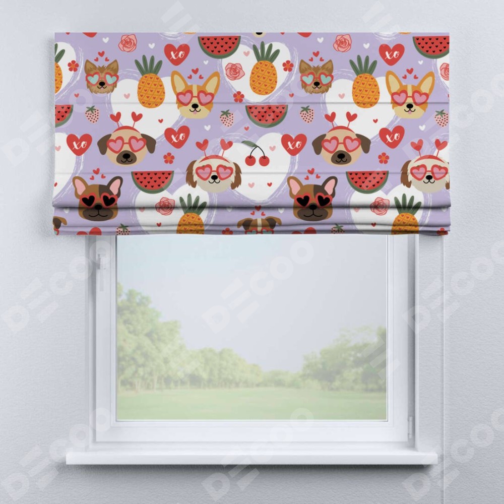 Римская штора производителя «Cortin», используется для проёма, пошита из ткани блэкаут с нанесением сублимационной печати «Забавные собачки». Имеет универсальный механизм и подходит для монтажа: на потолок, на стену и в нишу.