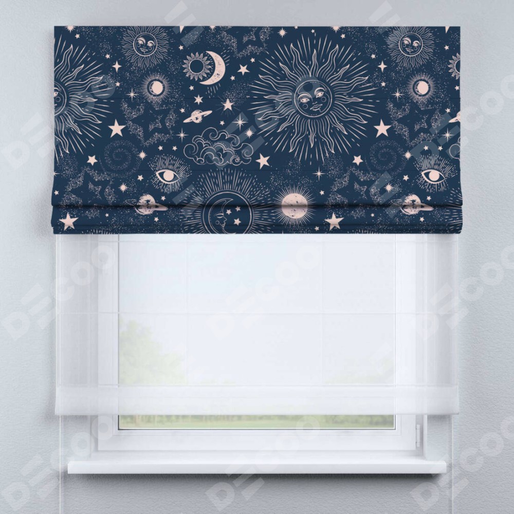 Римская штора день-ночь производителя «Cortin», используется для проёма, пошита из двух полотен, с лицевой блэкаут с нанесением сублимационной печати «Звёзды и планеты», вторая ткань тюль (по стандарту комплектуется тюль белого цвета артикул V-01). Имеет универсальный механизм и подходит для монтажа: на потолок, на стену и в нишу.