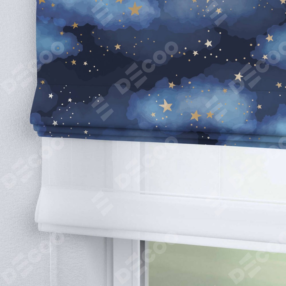 Римская штора день-ночь производителя «Cortin», используется для проёма, пошита из двух полотен, с лицевой блэкаут с нанесением сублимационной печати «Золотые звёзды», вторая ткань тюль (по стандарту комплектуется тюль белого цвета артикул V-01). Имеет универсальный механизм и подходит для монтажа: на потолок, на стену и в нишу.